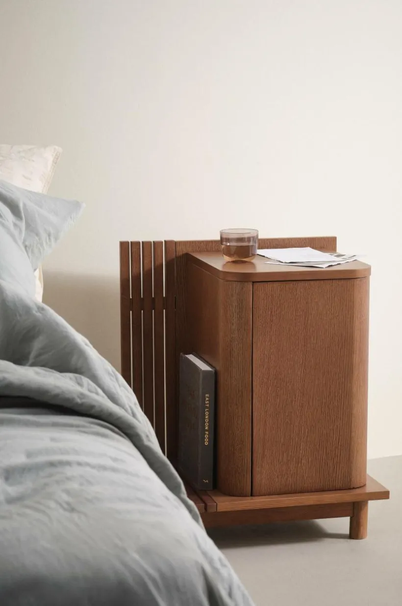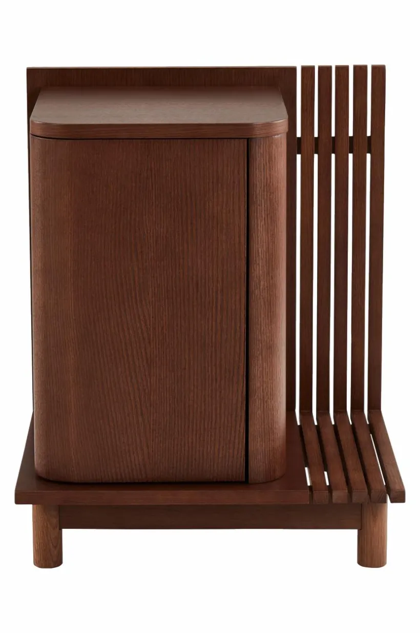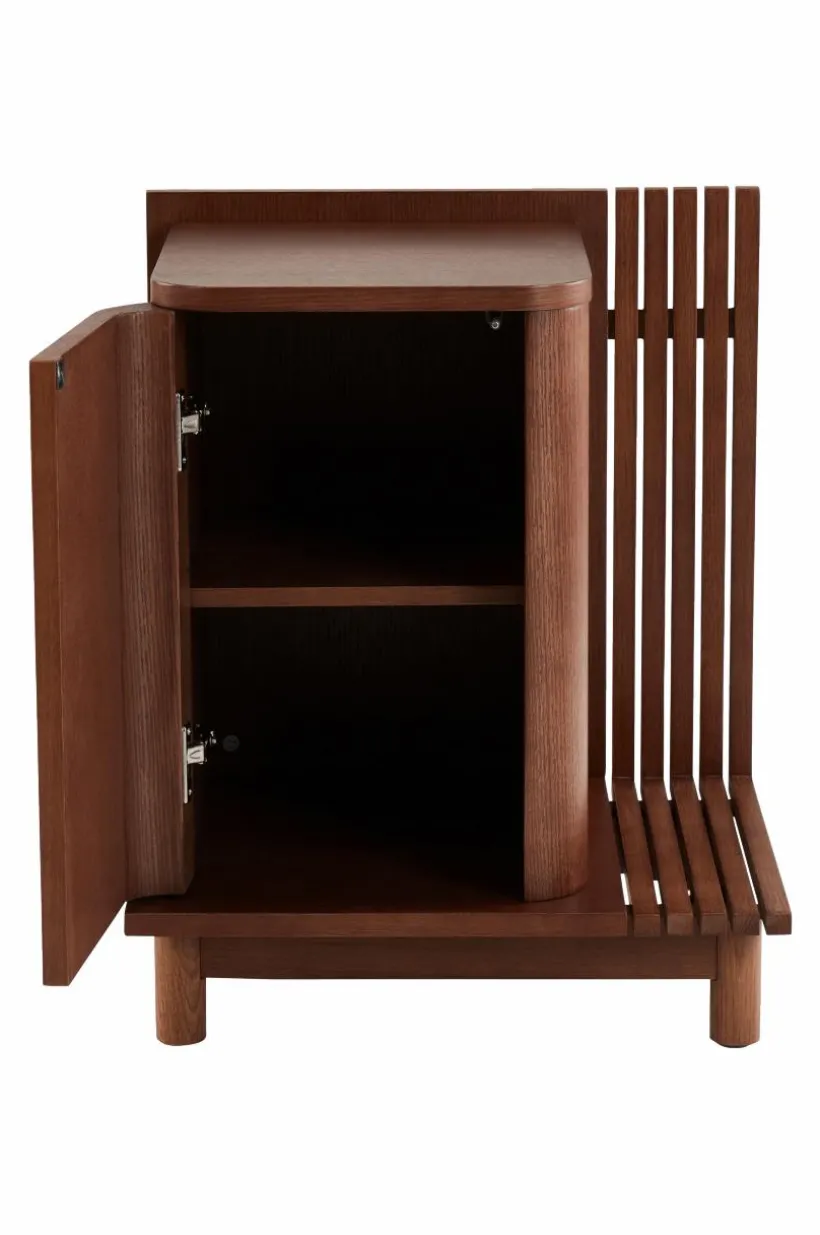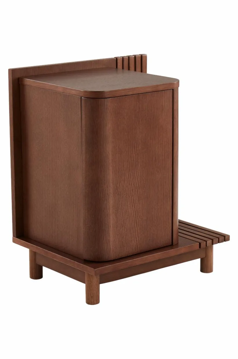Sängbord av massiv ek i kombination med MDF med matchande ekfaner. Den speciella möbeln är i snygg design med runda hörn och mjuka linjer som kan föra tanken till den japanska stilen. Sängbordet har en dörr med invändig hylla för praktisk förvaring. De runda raka ekbenen är fyra till antalet. Möbeln är behandlad med vattenbaserad lack. Viss montering krävs. Monteringsanvisning medföljer.