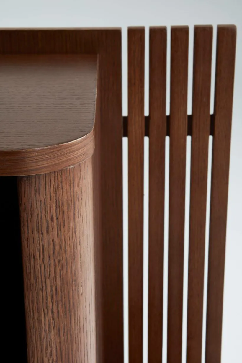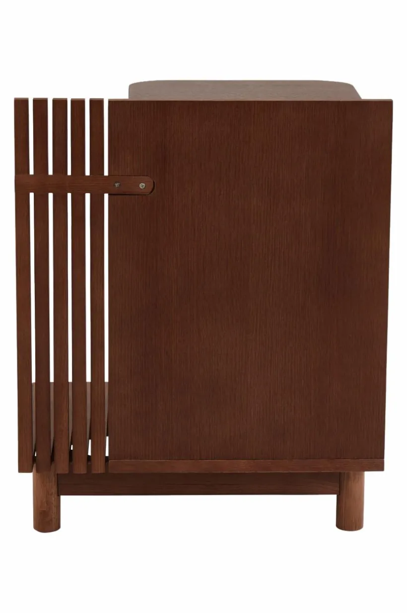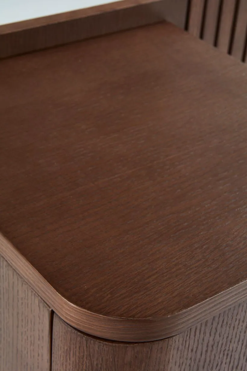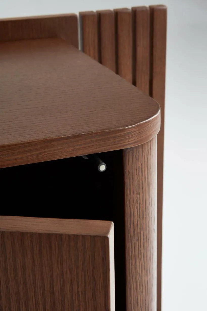 Sängbord av massiv ek i kombination med MDF med matchande ekfaner. Den speciella möbeln är i snygg design med runda hörn och mjuka linjer som kan föra tanken till den japanska stilen. Sängbordet har en dörr med invändig hylla för praktisk förvaring. De runda raka ekbenen är fyra till antalet. Möbeln är behandlad med vattenbaserad lack. Viss montering krävs. Monteringsanvisning medföljer.
