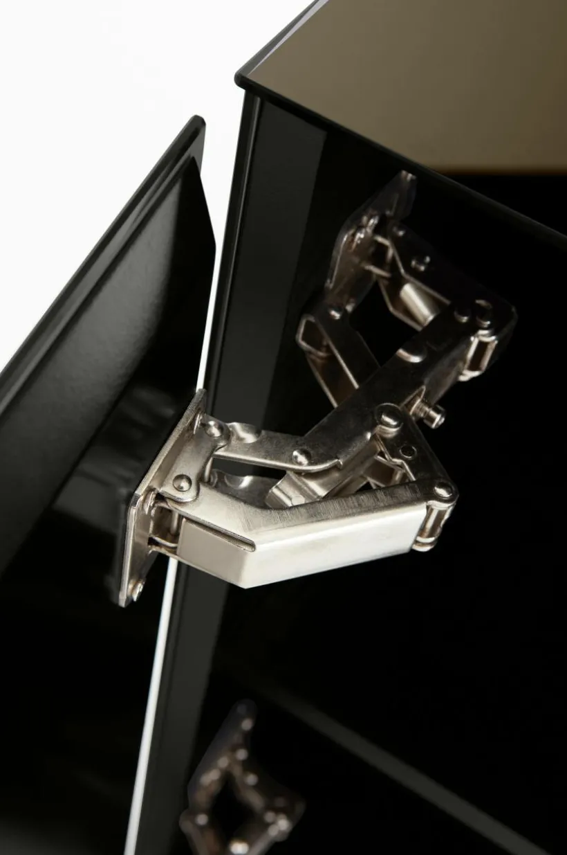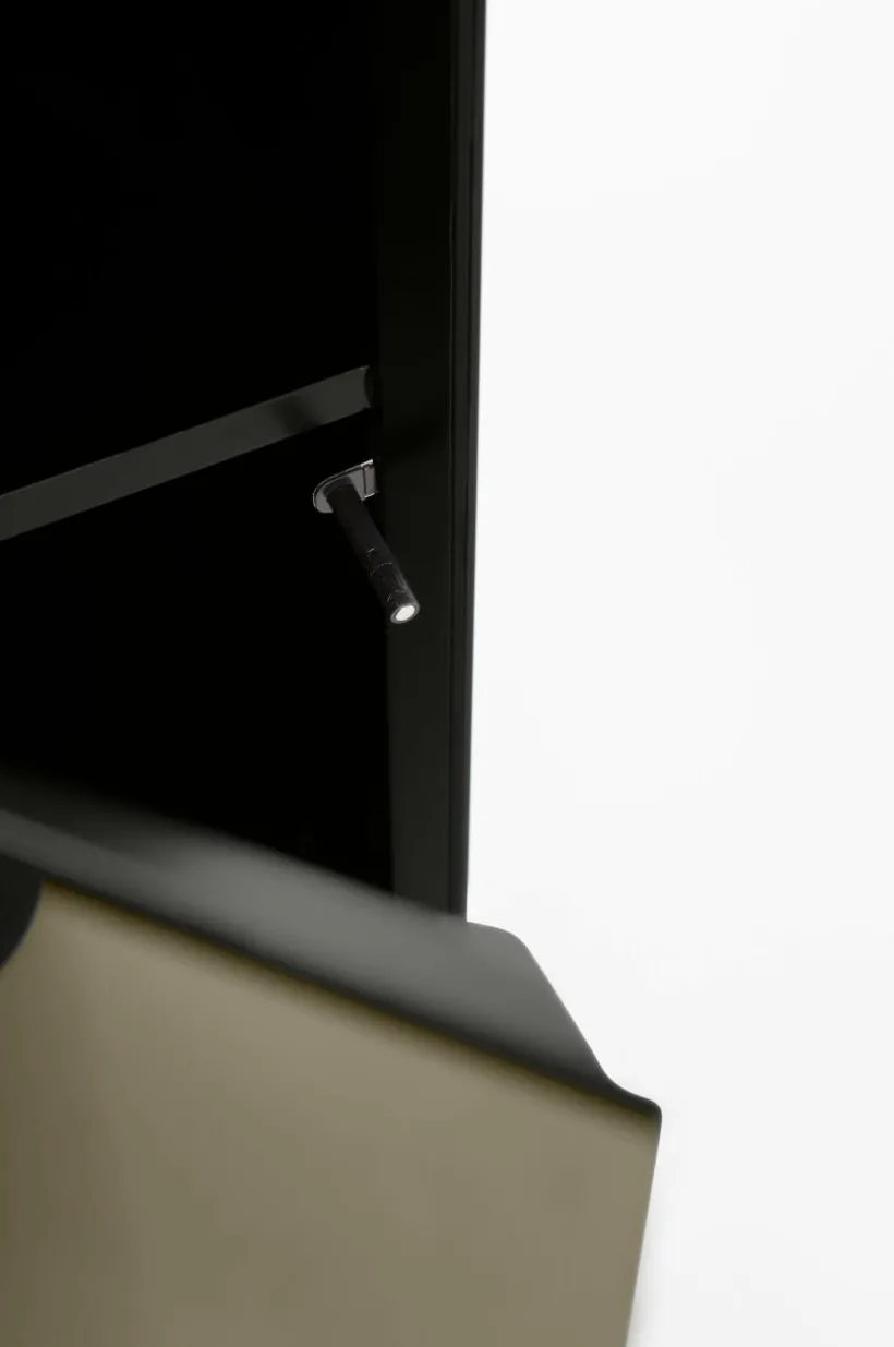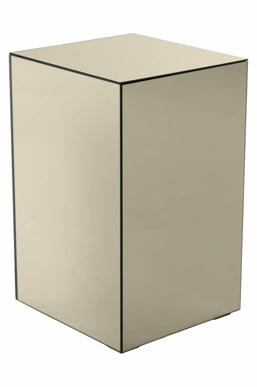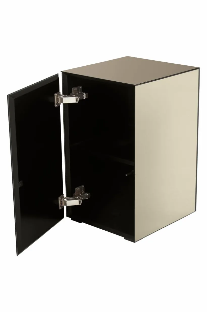 Sängbord av spegelglas med stomme av FSC-certifierad MDF. Finessen med detta sängbord är att det har ett dolt skåp bakom ena spegeln. Dörren har pushfunktion och mjukstängande gångjärn. Invändigt är skåpet svart med ett fast hyllplan. Sängbordet är spegelklätt på alla sidor och kanterna är mattsvarta. Bordet är lätt att placera på många olika platser i hemmet utöver att det är ett extraordinärt sängbord.