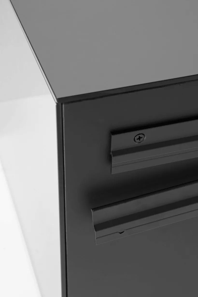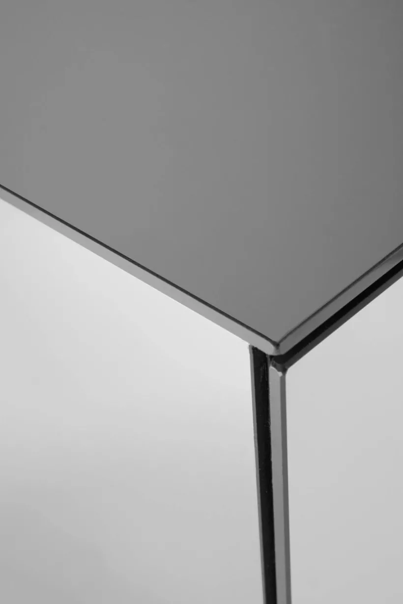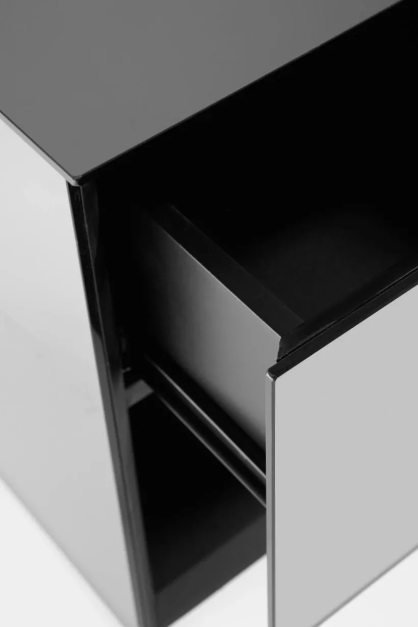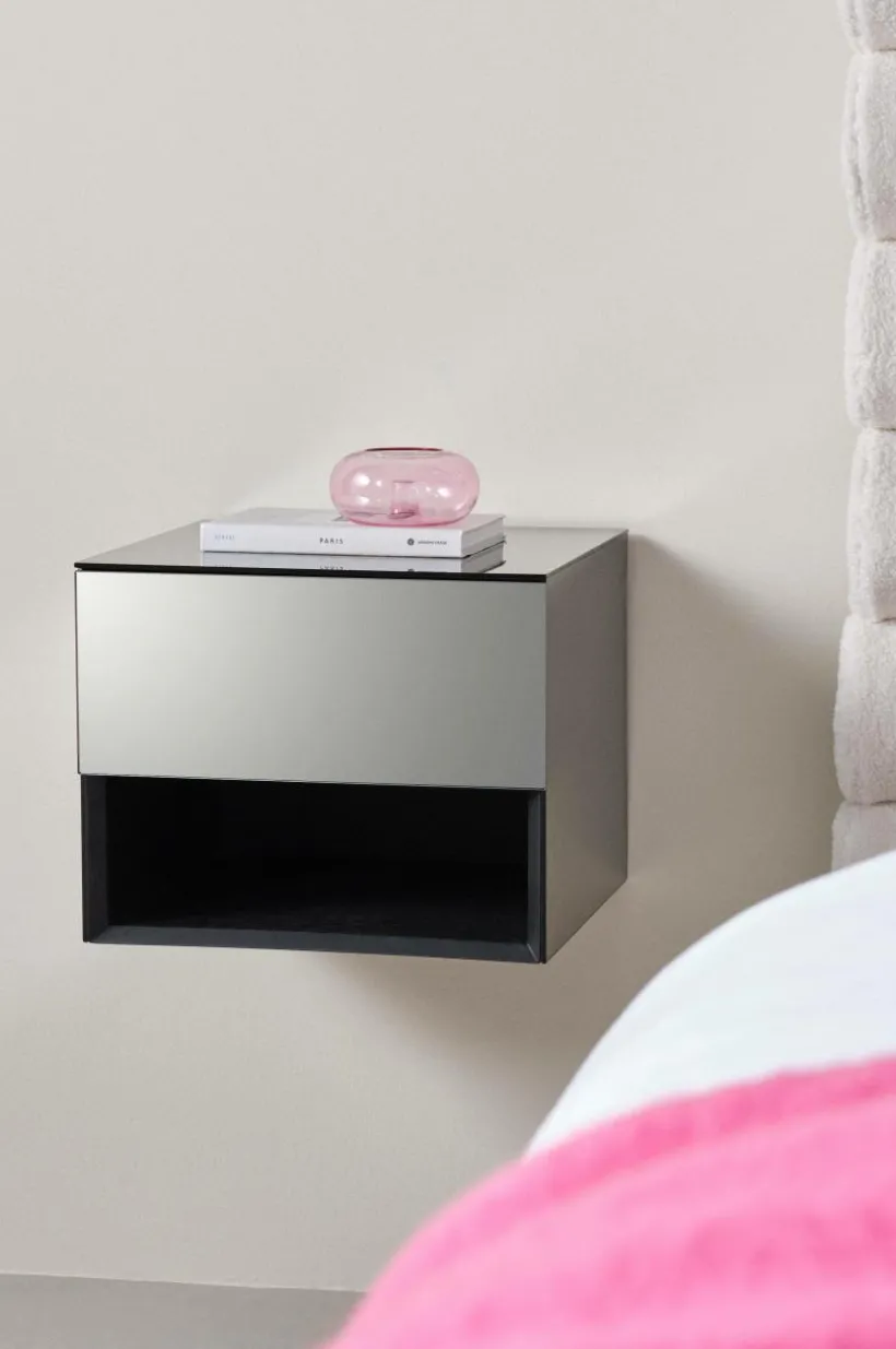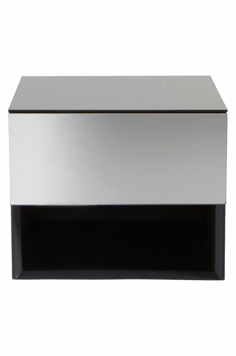 Sängbord av spegelglas med stomme av FSC-certifierad MDF. Detta sängbord är tänkt att hänga på väggen. Bakom spegeln i framkant är det ett dolt skåp och där under en öppen hylla. Dörren har pushfunktion och mjukstängande gångjärn. Invändigt är skåpet svart. Sängbordet är spegelklätt på alla sidor och kanterna är mattsvarta. Bordet är lätt att placera på många olika platser i hemmet utöver att det är ett extraordinärt sängbord.