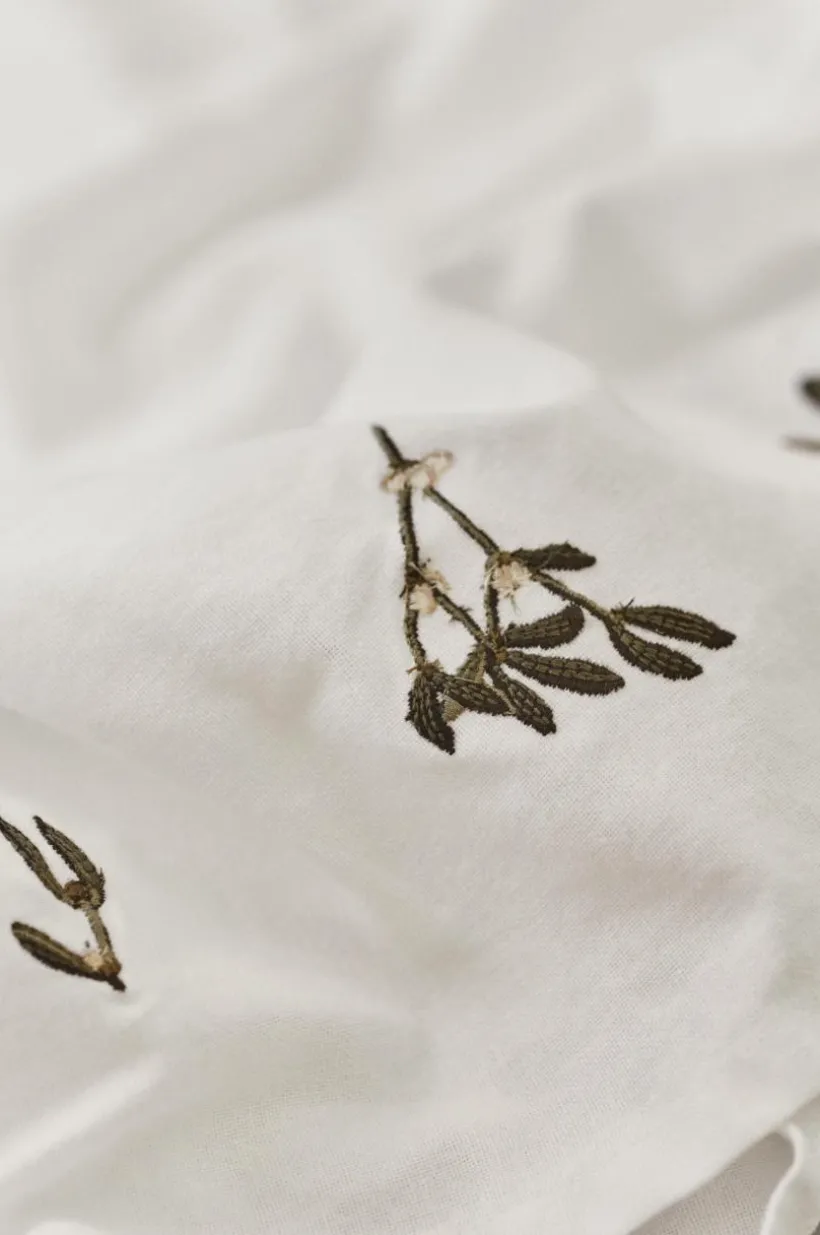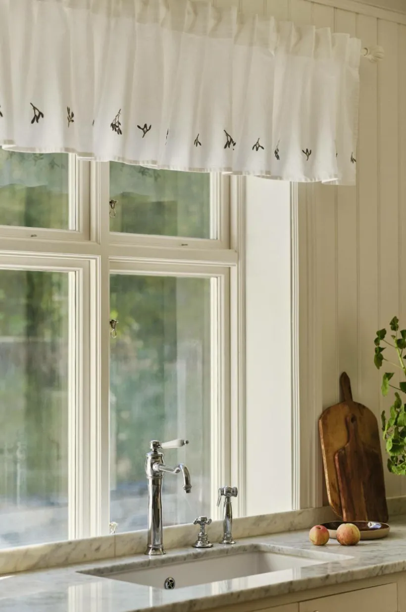 MISSY gardinkappa tillverkad av mjuk bomull och linne. Gardinkappan har broderi nedtill på vit botten. Den här gardinkappan är tvättad för extra mjukhet och ger mysig charm året runt, samtidigt som den också ger en krispig julkänsla.