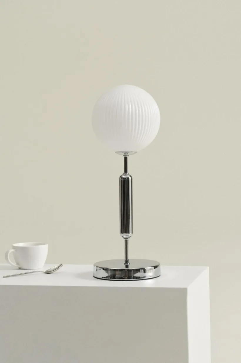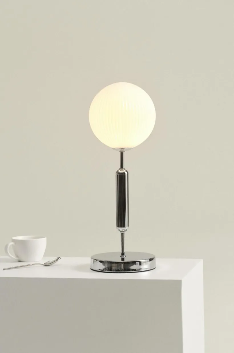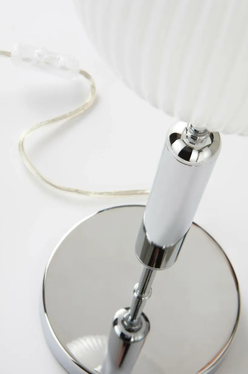 Bordslampa med kromad fot av järn och rund glaskupa med strukturränder i glaset, vilket ger ett fint sken. Strömbrytaren sitter på den transparenta sladden. Väggkontakten är Europa-modell, det vill säga platt och med tunnare stift (4 mm).