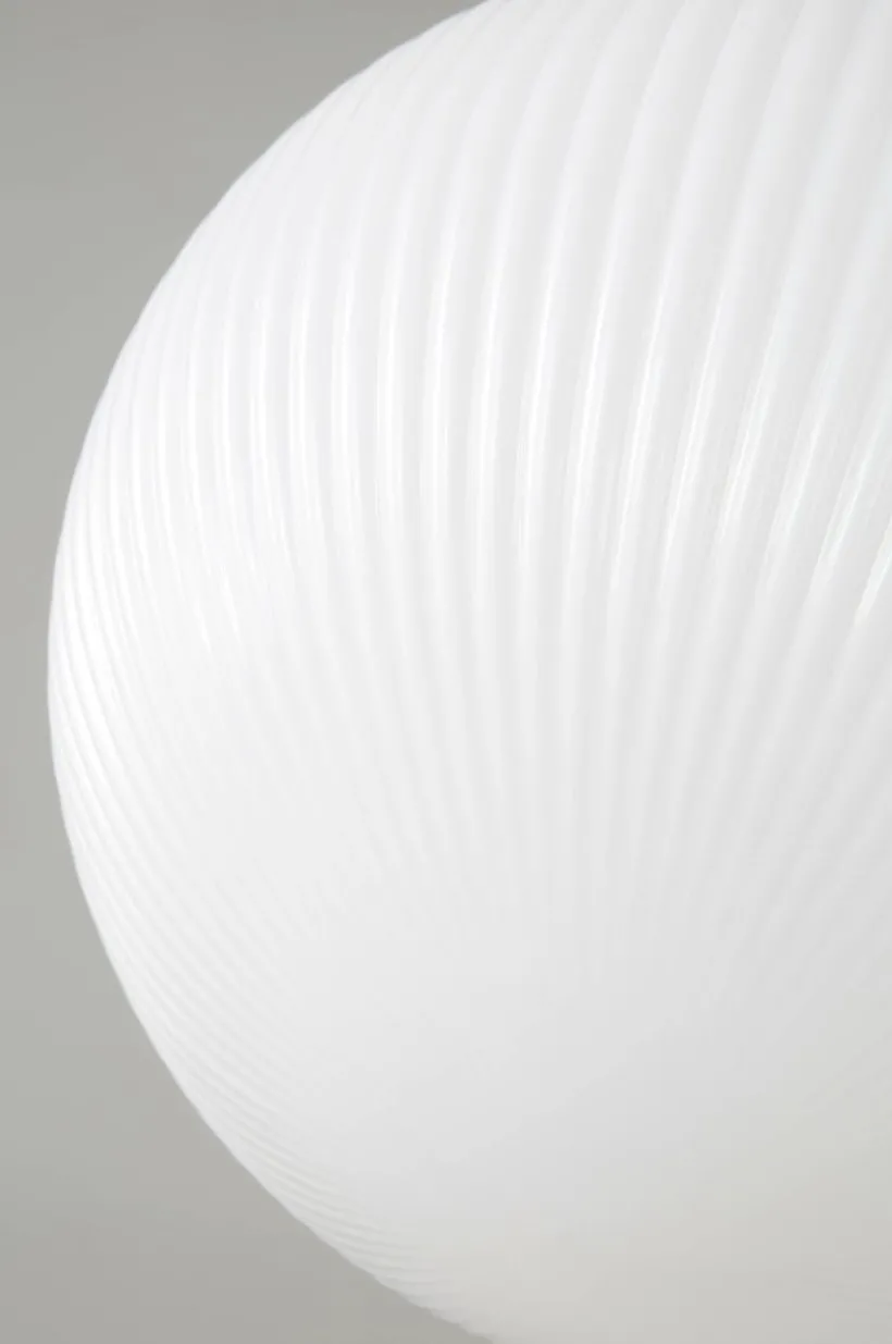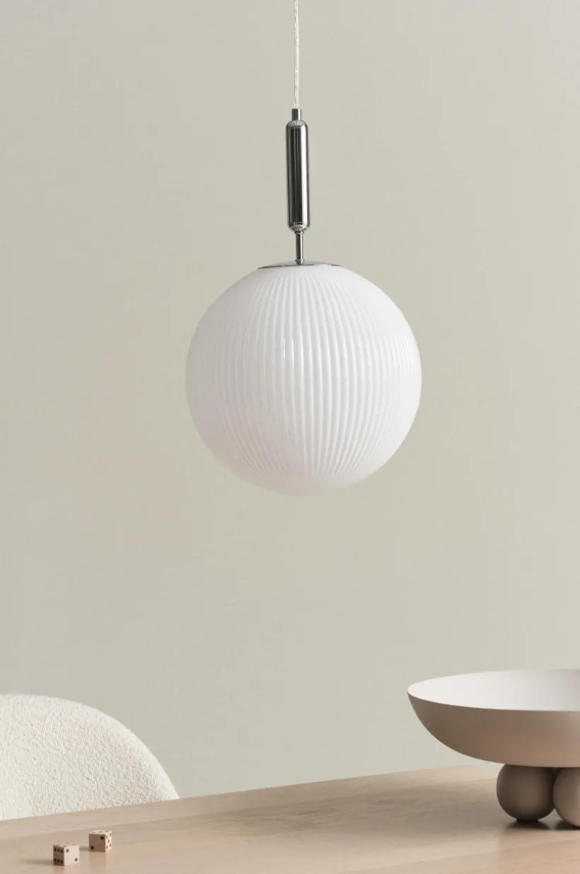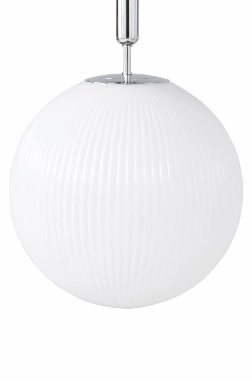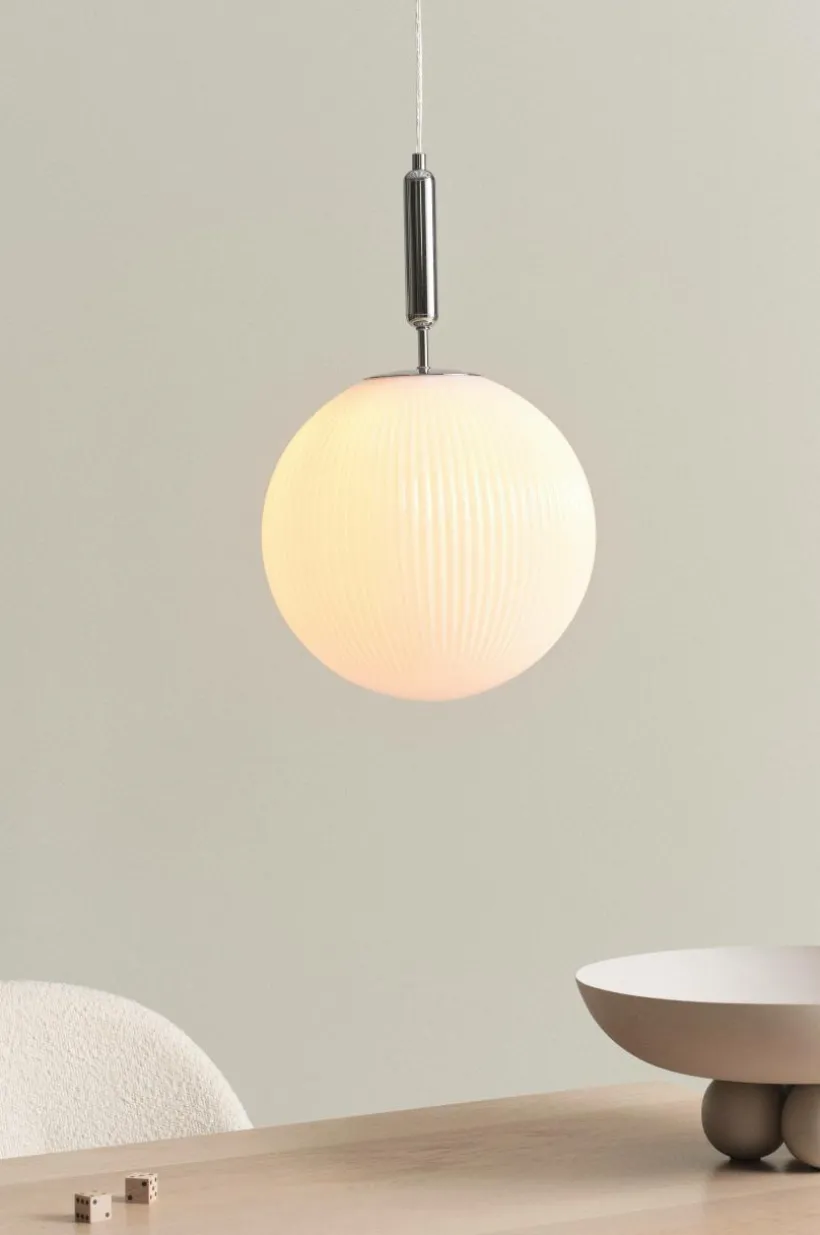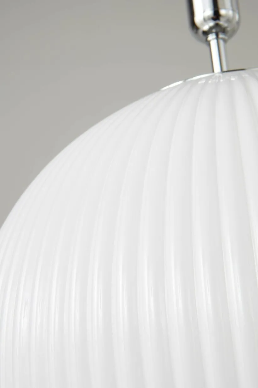 Taklampa med vacker, rund glaskupa som har effektfulla reliefränder. Den klarblå färgen lyser fint när du tänder lampan och den är mycket dekorativ även släckt. Lampans fäste och takkopp är av järn i kromfärg. Sladden är transparent. Lampan är jordad, klass 1. På grund av EU-regler behövs en separat takkontakt i vissa länder. Takkontakten ska vara jordad (klass 1) och köps separat.
