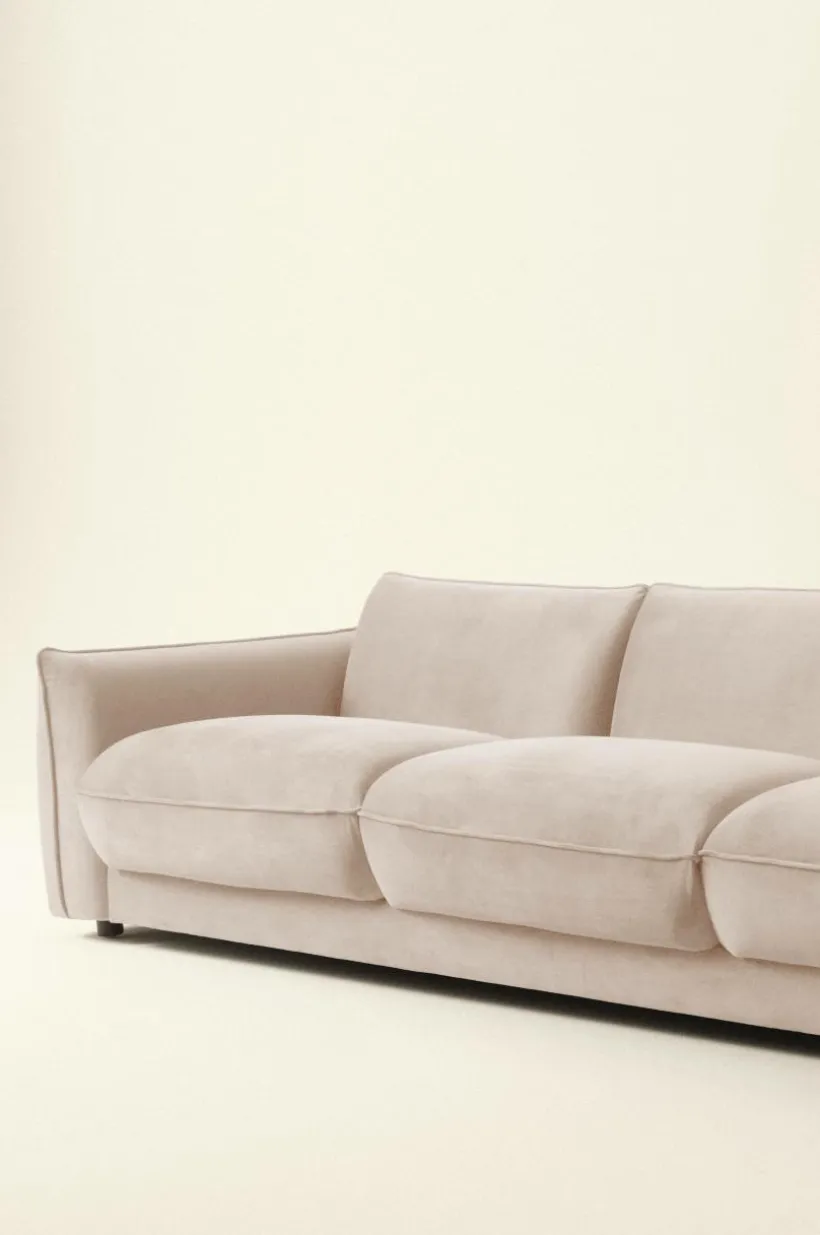 Rymlig 3-sitssoffa med stora, fylliga plymåer och mjuka, fina former. Designen är både attraktiv och avslappnad med runda former och mjuk sammetsklädsel av återvunnet material. Soffan har stabil stomme av furu och plywood. Sittdelen är uppbyggd av kallskum och zickzackfjädring vilket ger god sittkomfort, MOLTON är en soffa som är perfekt när det är dags att träffa vänner, kanske lite sällskapsspel på gång?