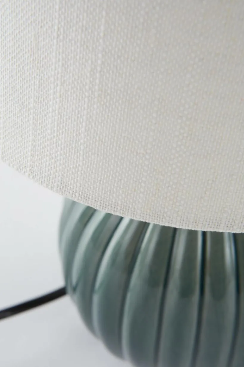 Bordslampa med fot av keramik och skärm av linne. Foten är mjukt rundad med lodräta reliefränder och vacker glasyr. Den släta linneskärmen ger en stilren känsla. Skärmen har metallstomme.