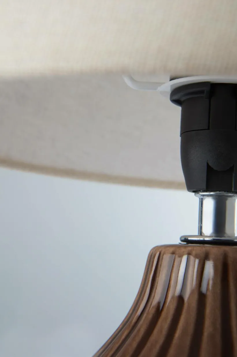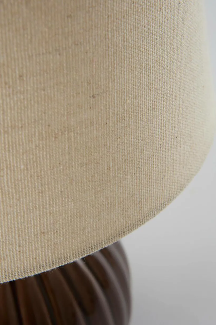 Bordslampa med fot av keramik och skärm av linne. Foten är mjukt rundad med lodräta reliefränder och vacker glasyr. Den släta linneskärmen ger en stilren känsla. Skärmen har metallstomme.