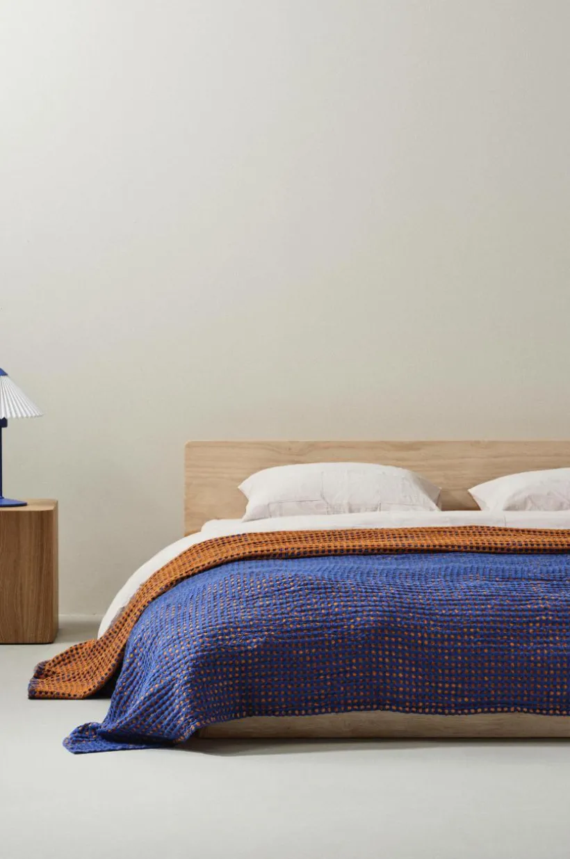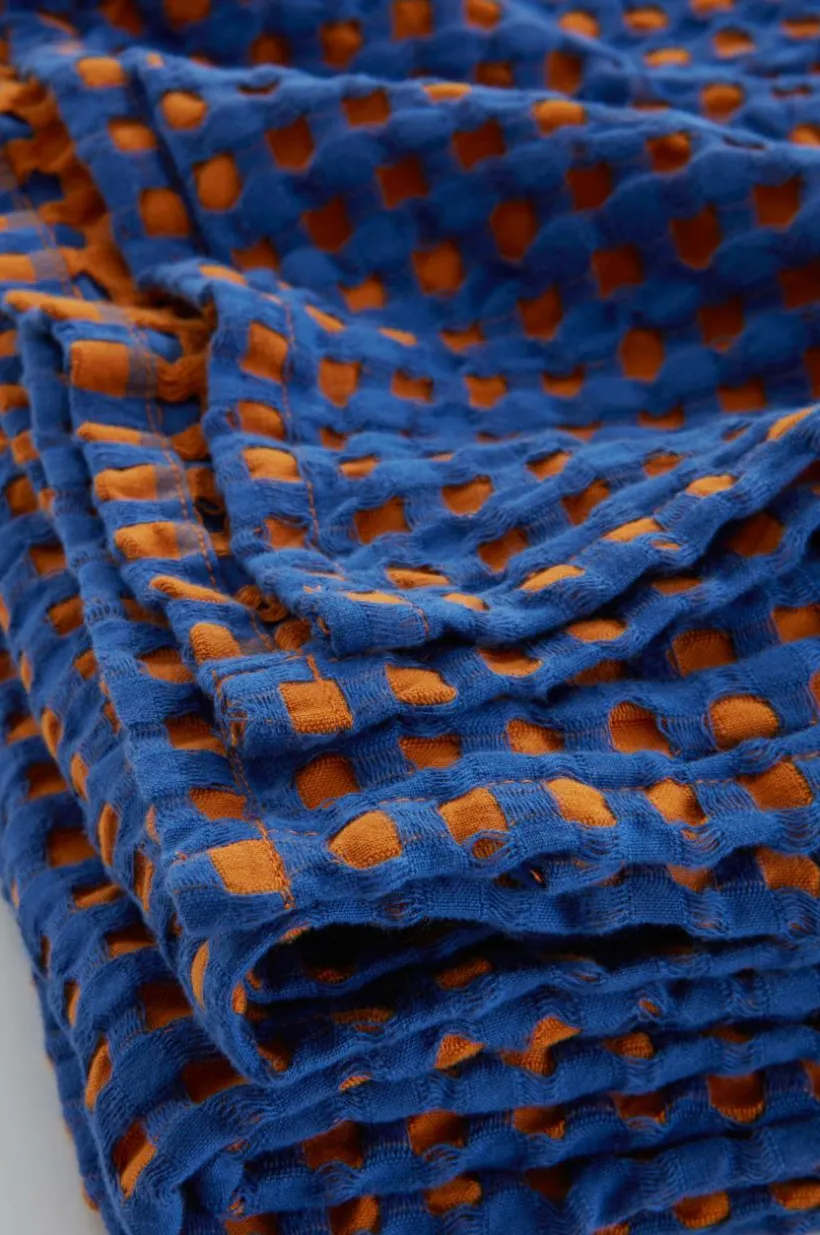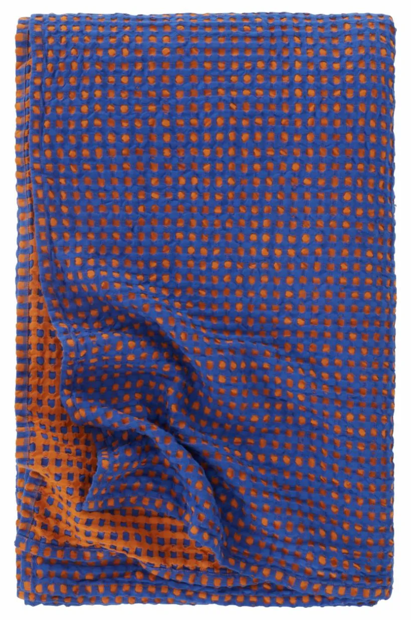 Överkast i skön bomullskvalité som är plaggtvättad, vilket gör det extra mjukt. Överkastet är följsamt och lätt att bädda med. Det garnfärgade rutmönstret som uppstår av den speciella vävtekniken är effektfullt och tyget får en våfflad struktur. Kanten runt om är fållad. Tygets gramvikt 140 g/m².