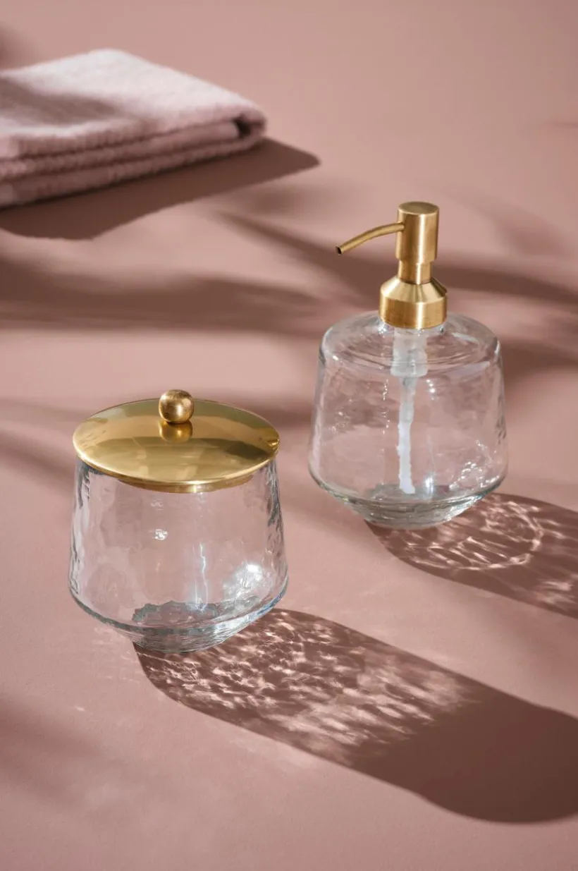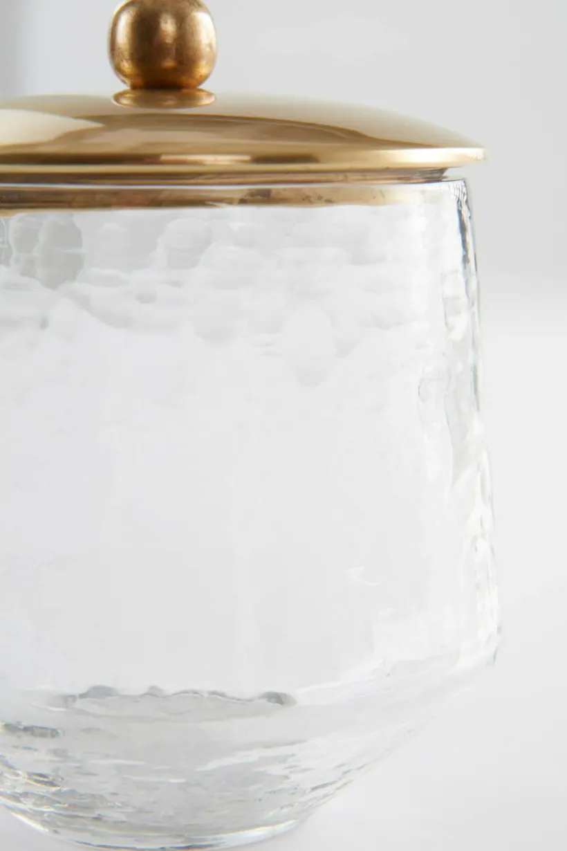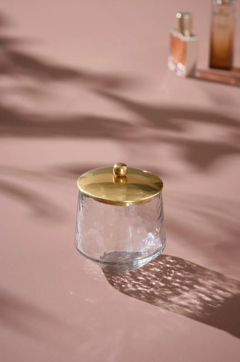 Burk med lock, där burken är av glas och locket är av mässing. Burken är tiokantig och glaset har hamrad karaktär som ger en gammaldags och handblåst känsla. Den fina lilla burken passar i badrummet. Allt från bomullstussar till smycken och andra små värdesaker kan förvaras i den.