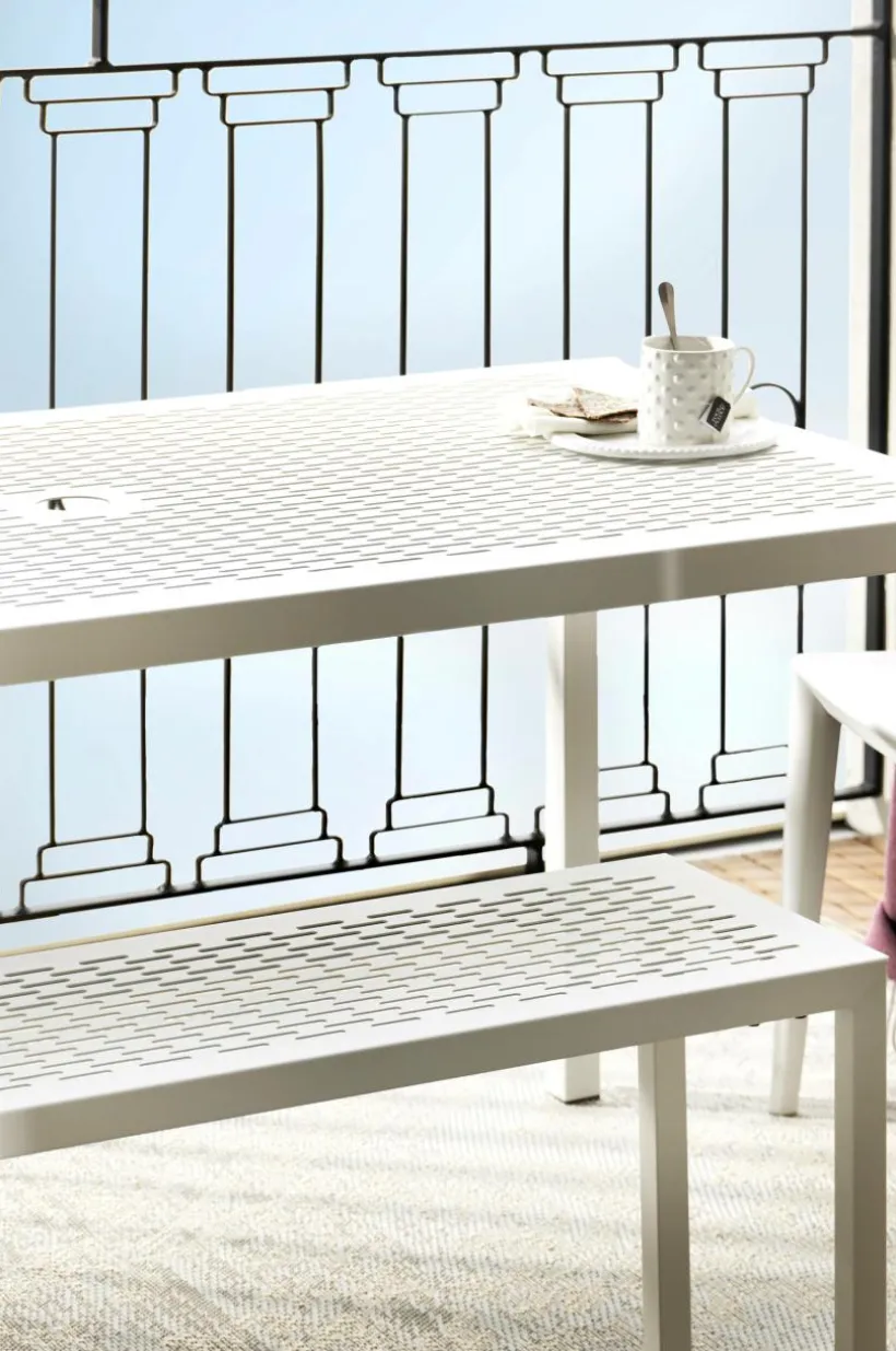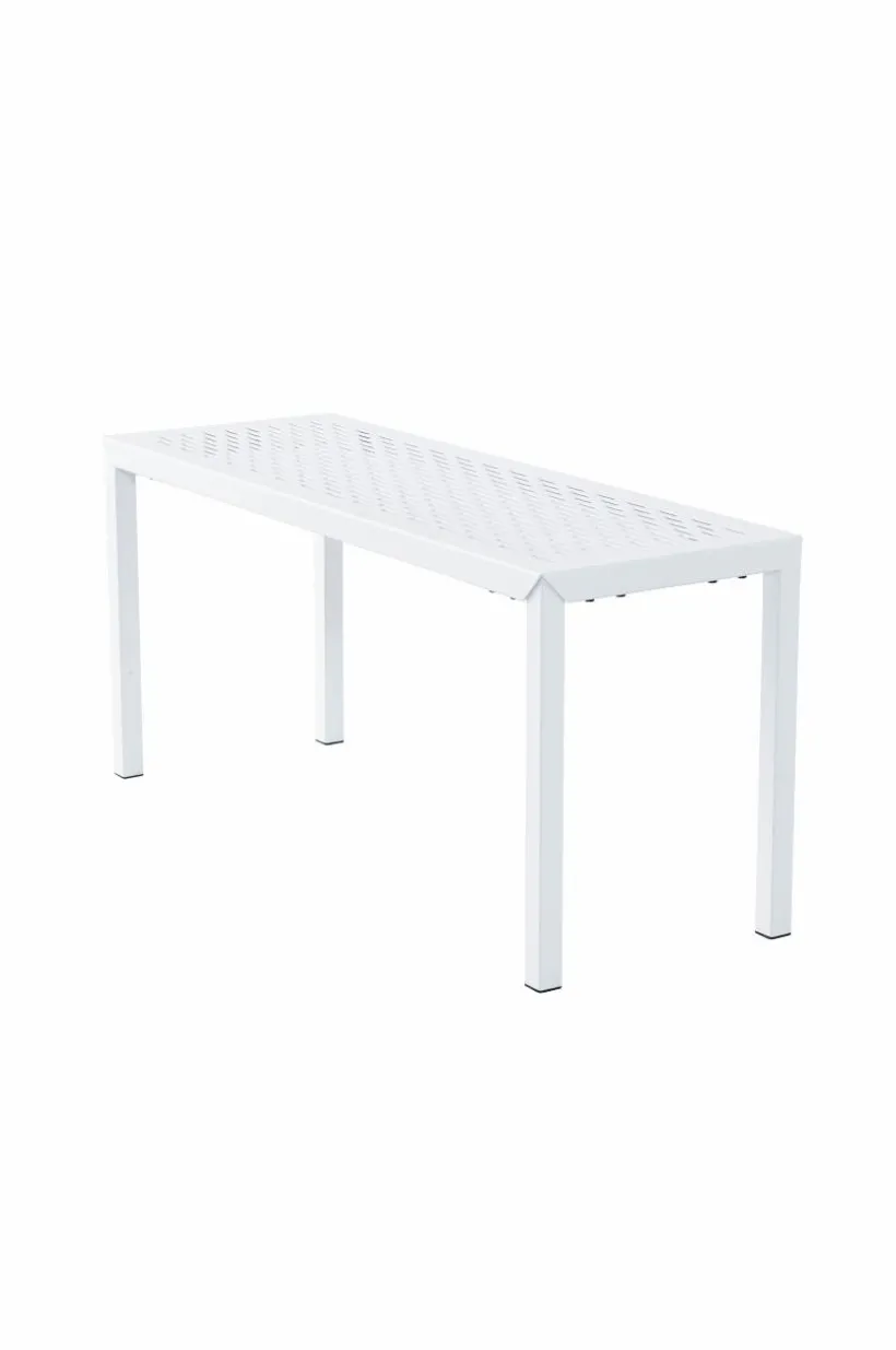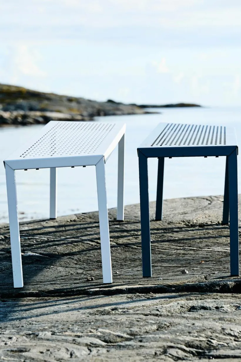 Bänk av pulverlackad metall med hålslaget mönster ger ett intryck av både lätthet och kvalitetskänsla. Det är utomhus vi vill vara hela långa sommaren och då ska det helst finnas möjlighet att sitta vid tåliga möbler som inte behöver tas in om det blir regn. För utomhusbruk, men gör sig också bra inomhus.