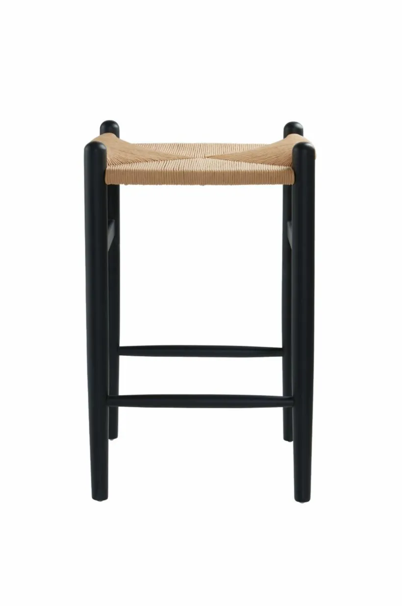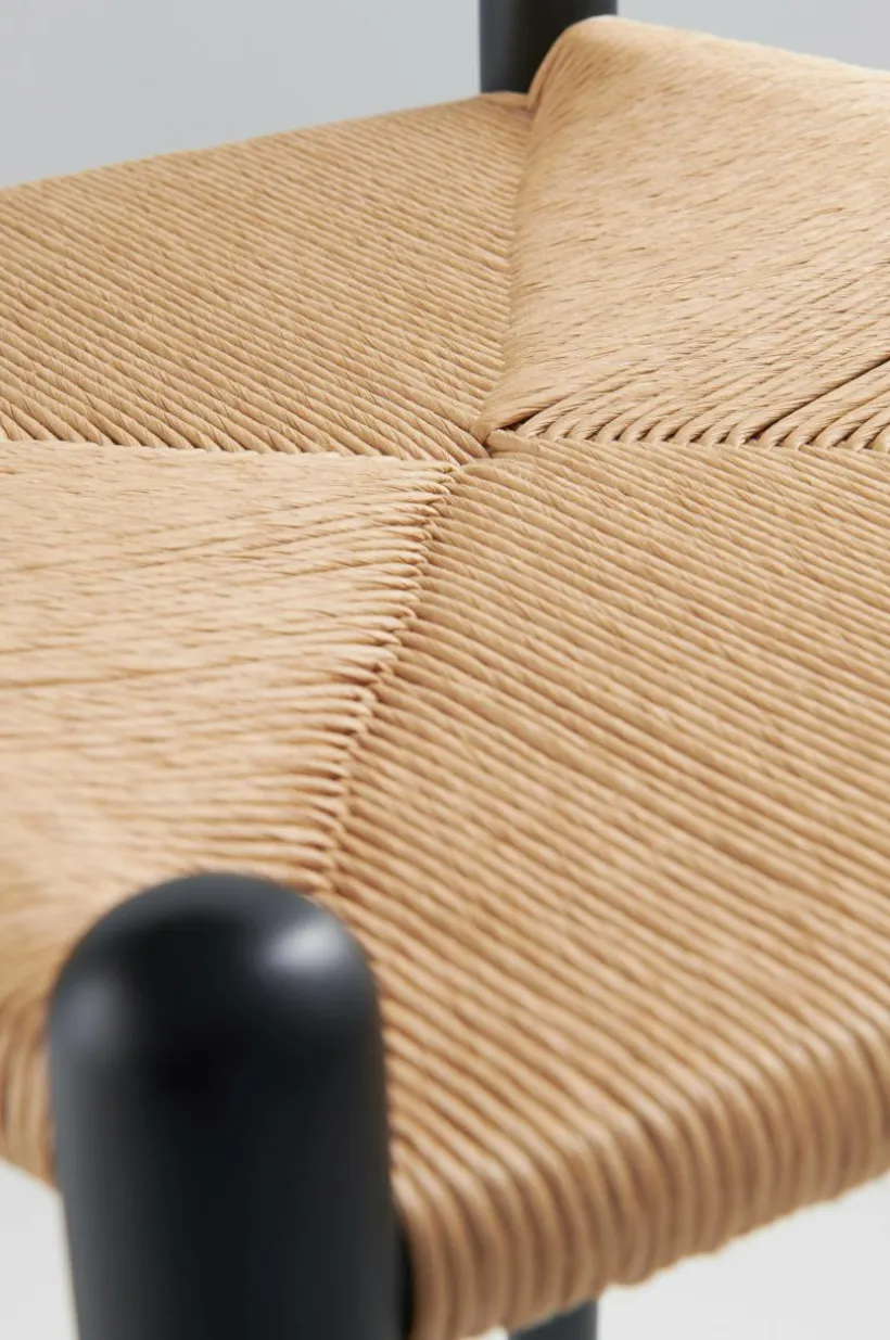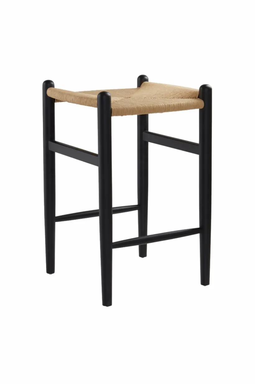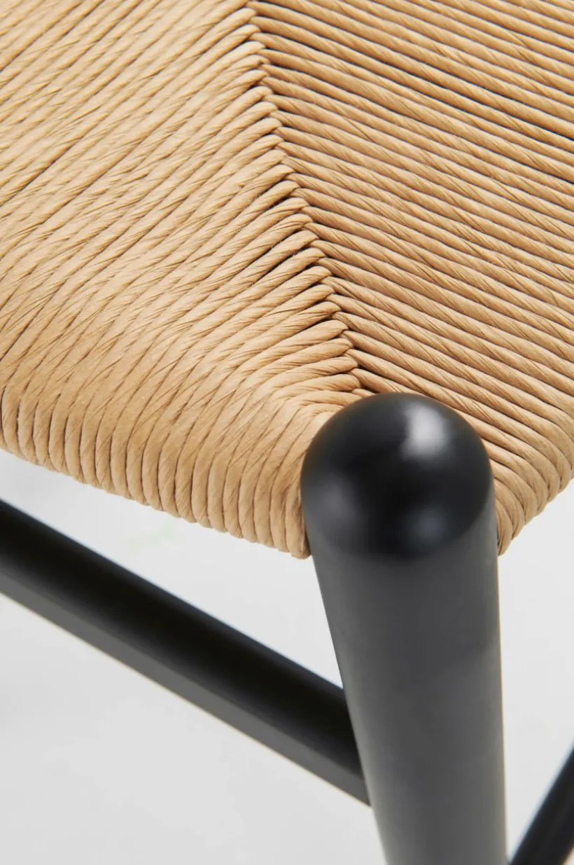 Barpall i massivt trä med sits av papperssnöre som blir en vacker kontrast till trät och samtidigt ger bra sittkomfort. Vitsåpad och valnötsfinish är av alm. Matt svart och ljust trä är av björk.