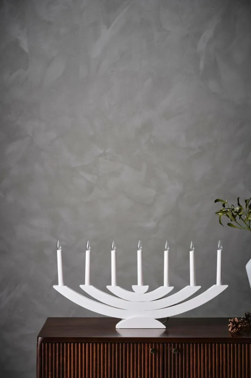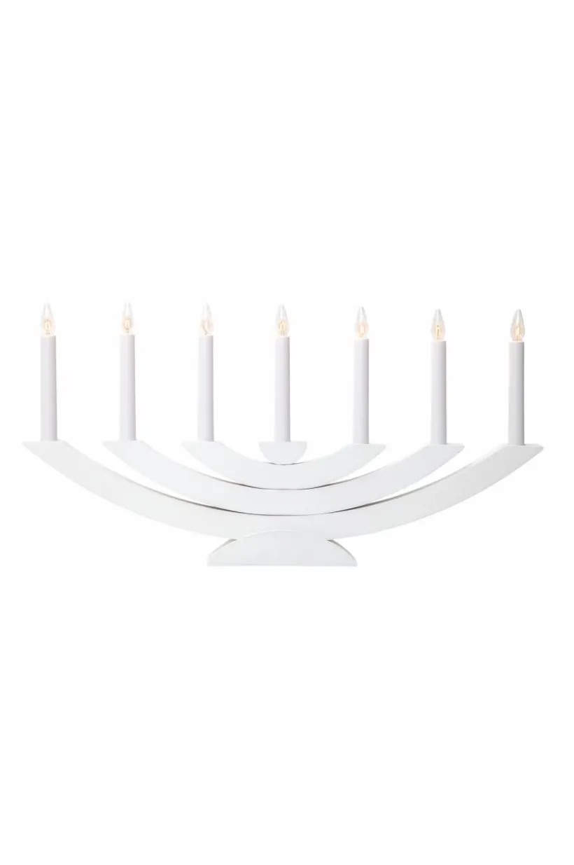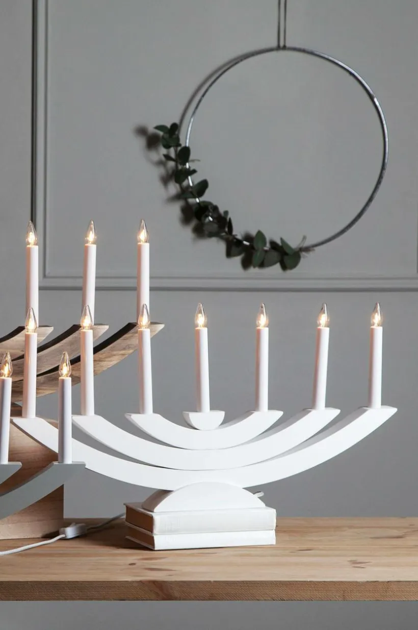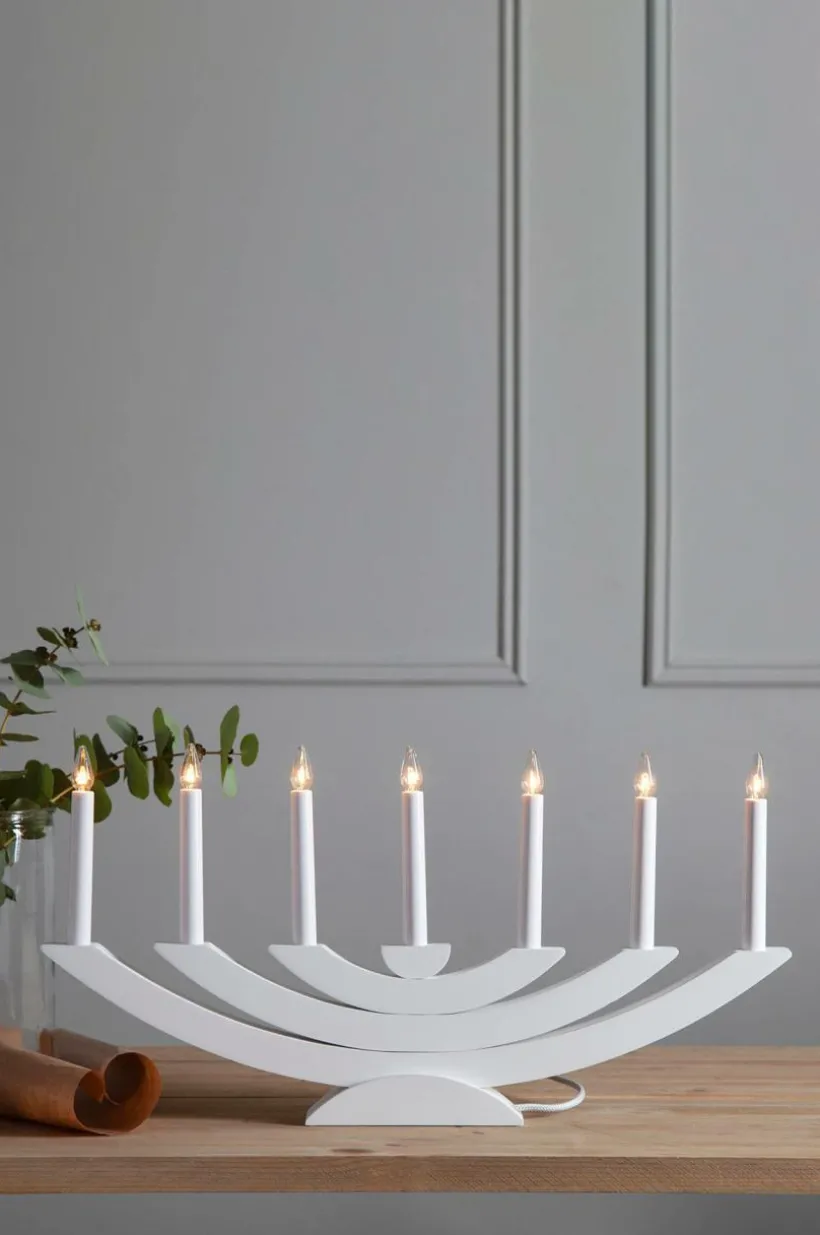 En elegant träljusstake i vit färg som skapar en härlig julstämning i ditt hem. Ljusskällor ingår. Textilsladd, sladdlängd 1,8 m.