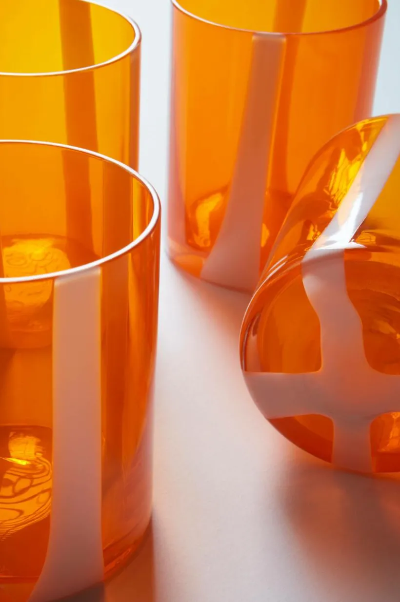 4-pack glas av färgat glas med vertikala oregelbundna ränder i vitt. De raka, färgstarka glasen piggar upp din dukning på ett somrigt och lekfullt sätt och allt från bubblande vatten till läskande måltidsdryck smakar extra gott.