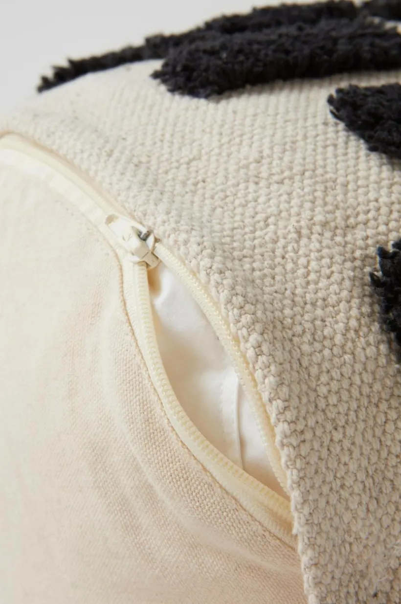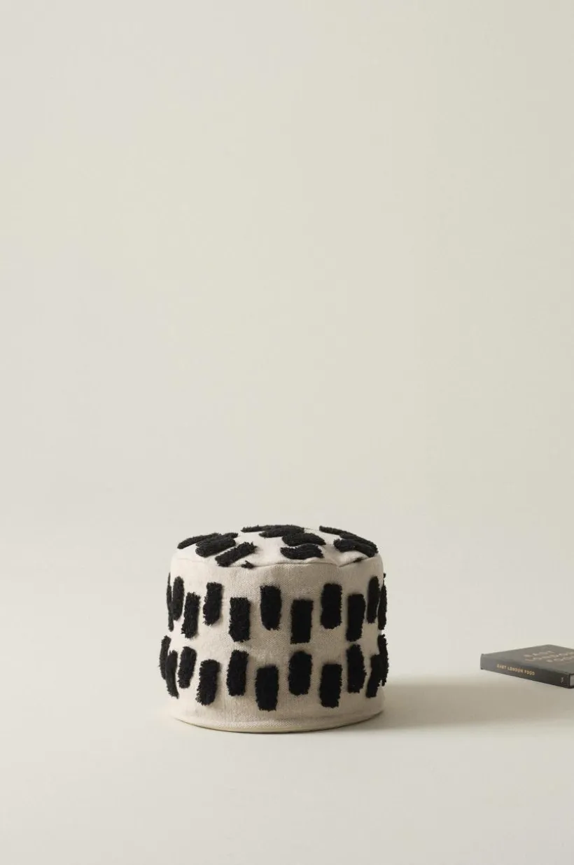 Rund puff av kraftigt, vävt tyg med tuftat mönster, luggen bildar kvadrater på den linnefärgade botten. Puffen har en innerkudde med mjuk stoppning av polystyrenkulor som formar sig bekvämt när du sitter på den. Dragkedja längs nederkanten, så du kan ta av överdraget. Lugghöjd 1 cm.