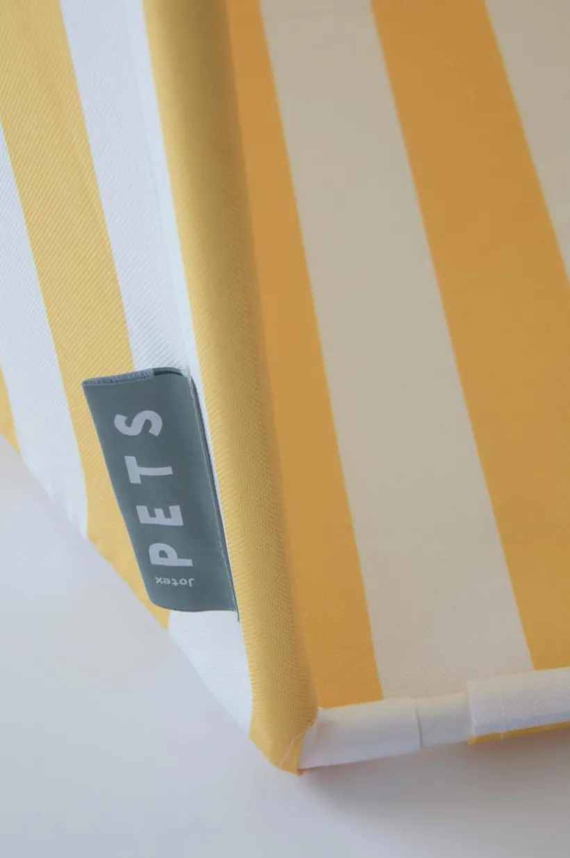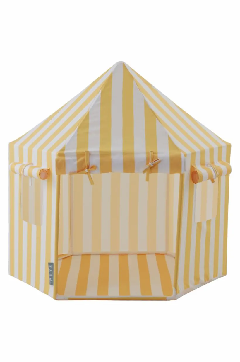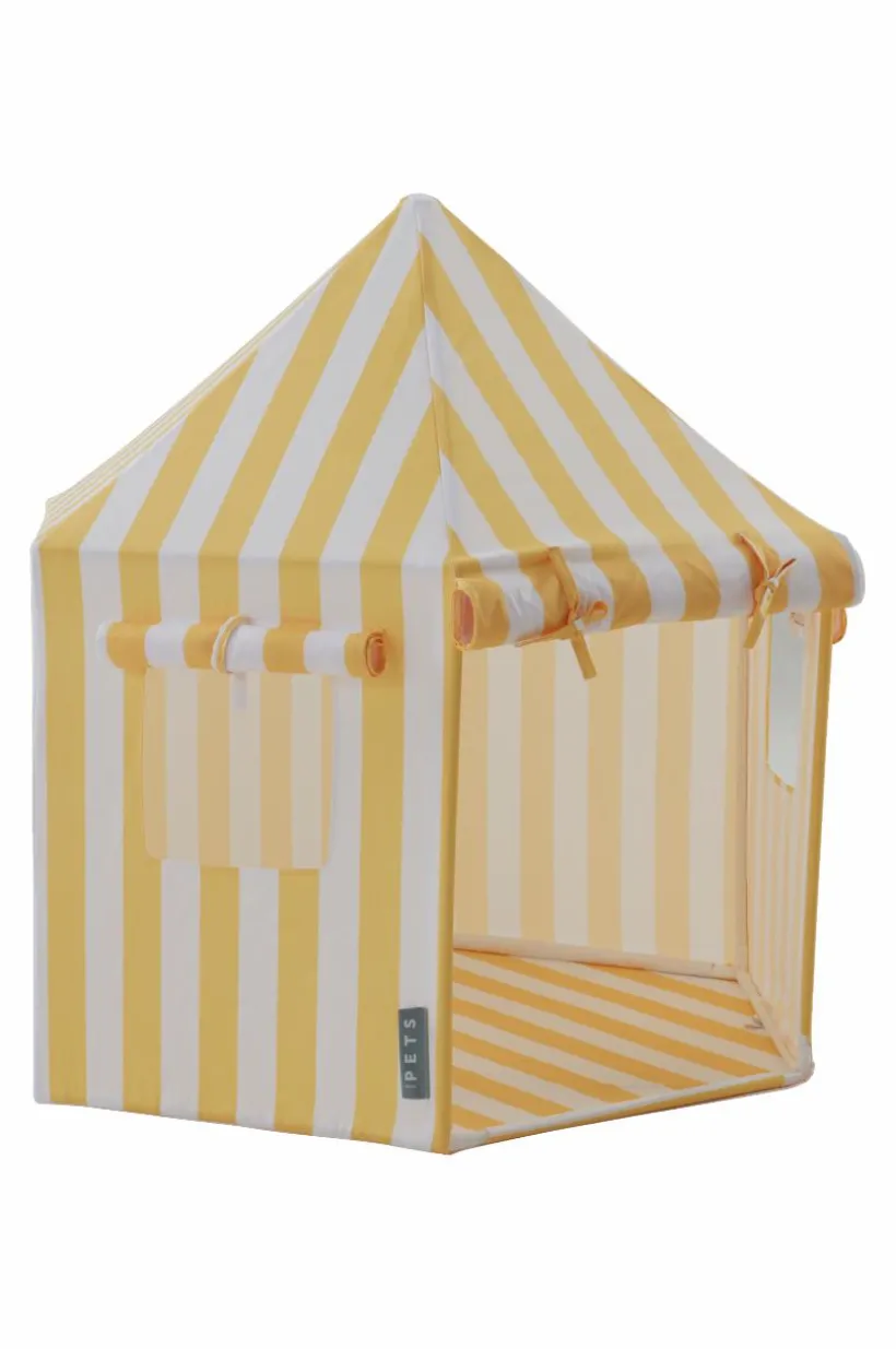Sexkantigt djurtält med randig tältduk av vattenavvisande polyester och tältpinnar av plast. Tältet ger en skuggig, torr och vindskyddad plats att vila på i trädgården eller på balkongen. Tältet har öppningar så du kan låta luften strömma igenom om det blir för varmt. Det randiga mönstret är digitaltryckt vilket ger klara distinkta färger. Tältet kan användas både inne och ute. Tänk på att inte lämna tältet ute när du inte använder det. Förankra det gärna i marken om det blåser.