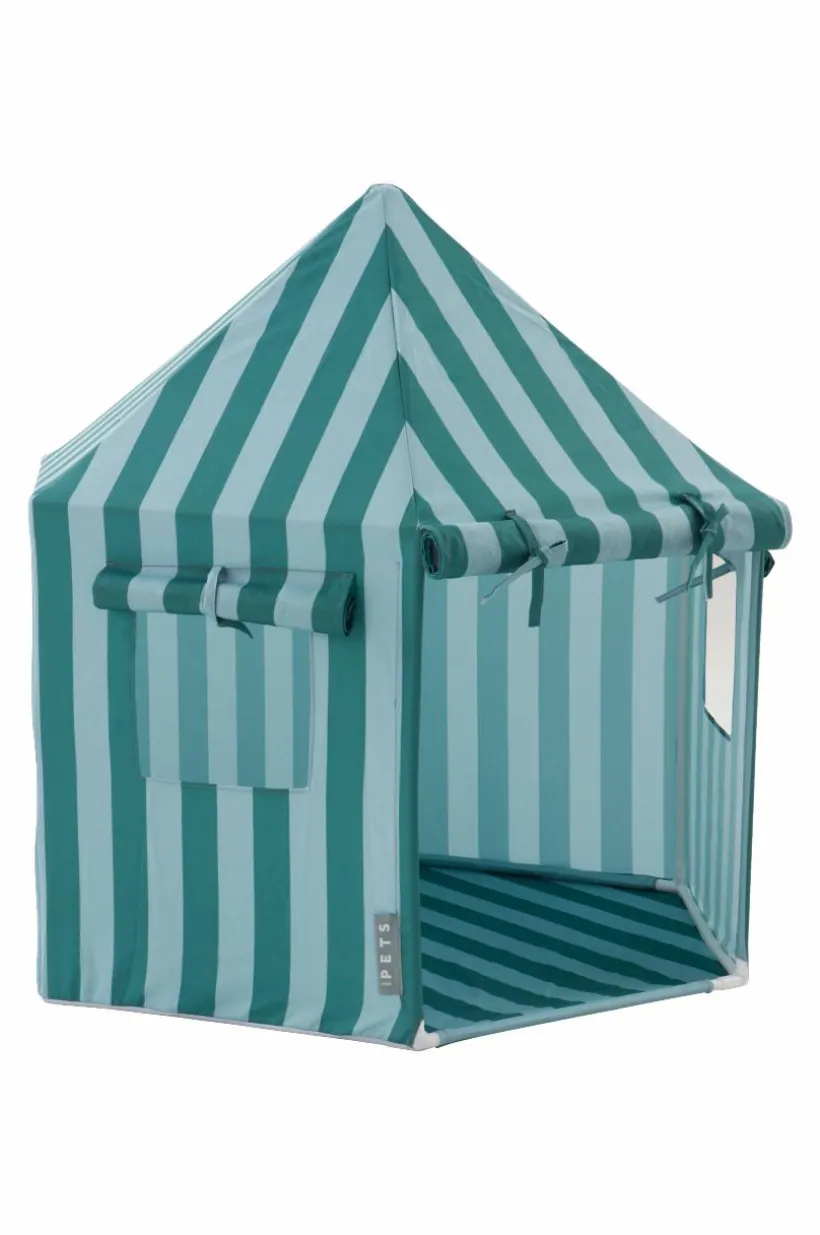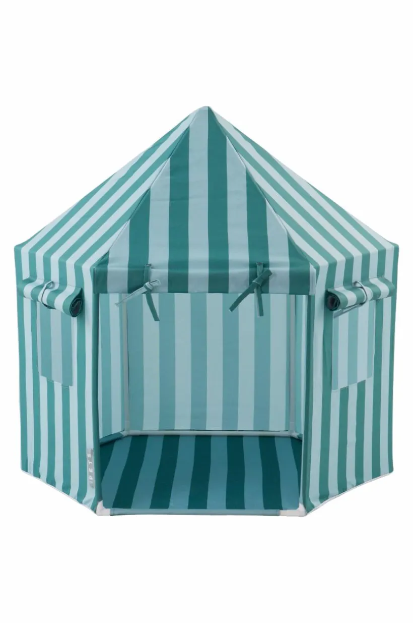 Sexkantigt djurtält med randig tältduk av vattenavvisande polyester och tältpinnar av plast. Tältet ger en skuggig, torr och vindskyddad plats att vila på i trädgården eller på balkongen. Tältet har öppningar så du kan låta luften strömma igenom om det blir för varmt. Det randiga mönstret är digitaltryckt vilket ger klara distinkta färger. Tältet kan användas både inne och ute. Tänk på att inte lämna tältet ute när du inte använder det. Förankra det gärna i marken om det blåser.
