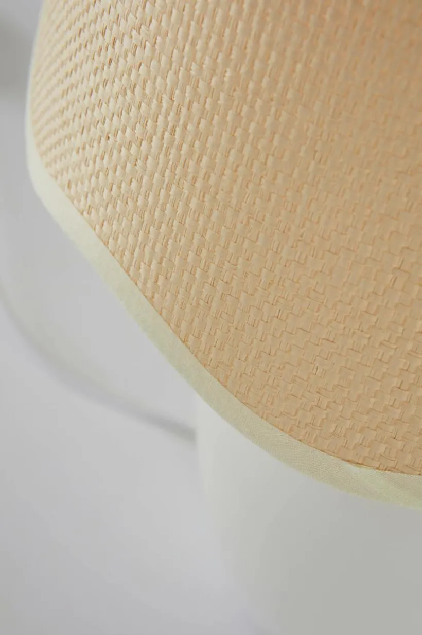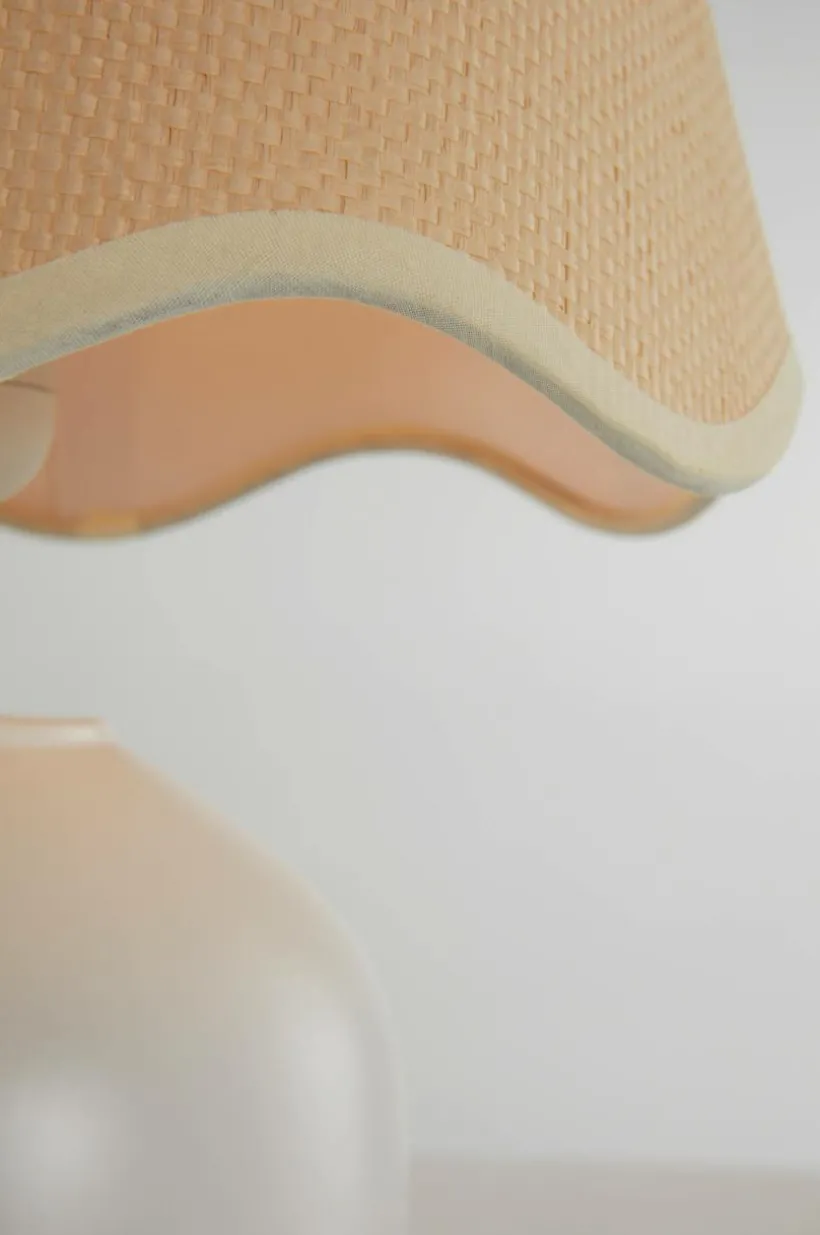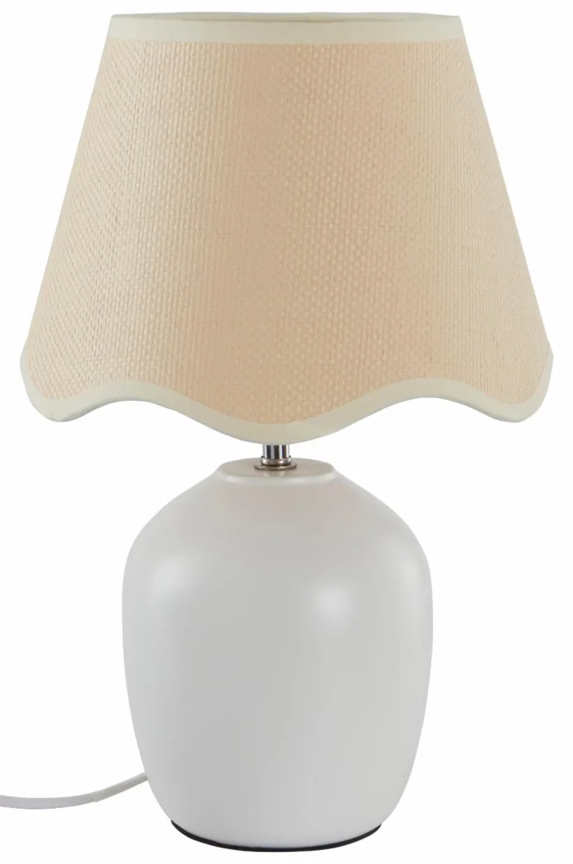 Bordslampa med slät, glacerad keramikfot som matchas med en rund lampskärm av jute med vågad kant. Tyget i skärmen är lite glesare vävt och den sprider ett mysigt sken. Skärmen har metallstomme. Vit sladd med strömbrytare på sladden. Lampan är ojordad, klass 2.