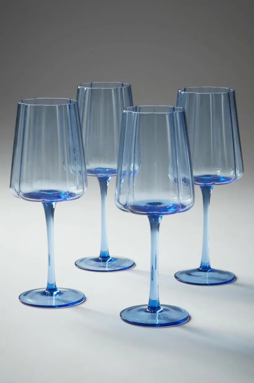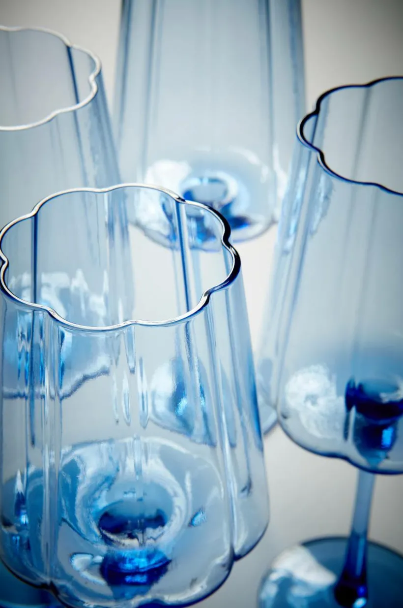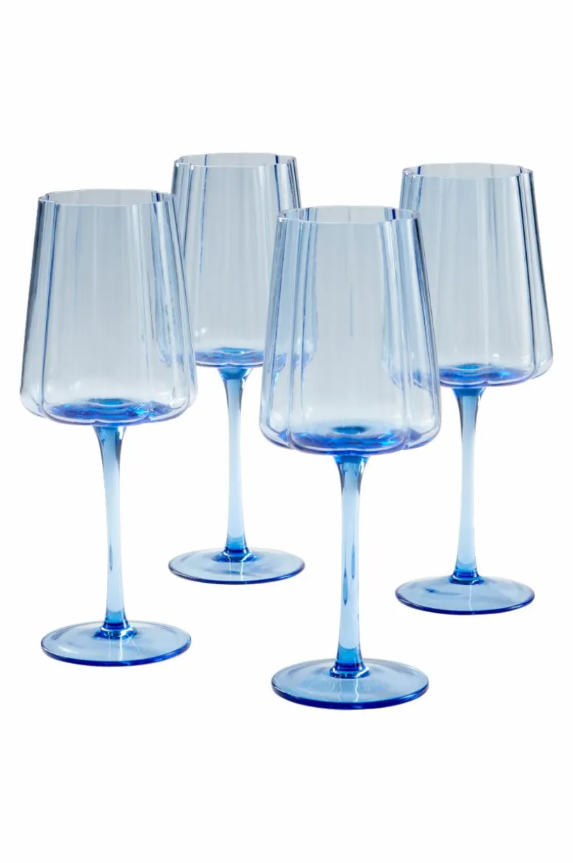 4-pack vinglas på fot. I serien NINA har glasen somrig blomform och kommer i en himmelsblå färg. Vinglaset i serien NINA passar fint till både vitt, rött och rosévin. Det är ett glas som passar in i en festlig och samtidigt bekväm och avslappnad stil. Tänk dig glasen NINA när du planerar sommarens garden party.