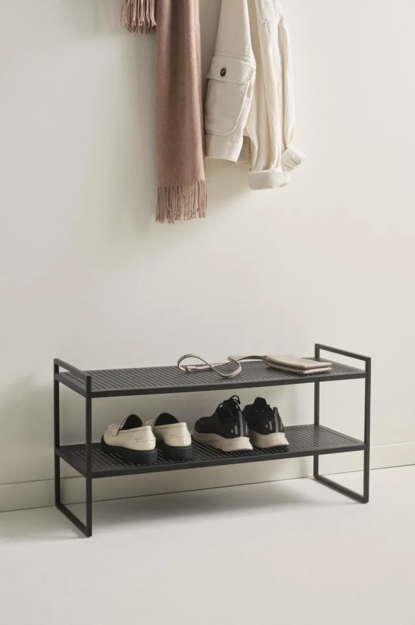 Skohylla i stål med matt, pulverlackerad yta. NOLAN är snygg och praktisk, formen är strikt och hyllplanen har perforerat hålmönster. Att samla skorna på ett ställe underlättar att hålla ordning i hallen och spar plats i en liten hall. Viss montering krävs. Monteringsanvisning medföljer.