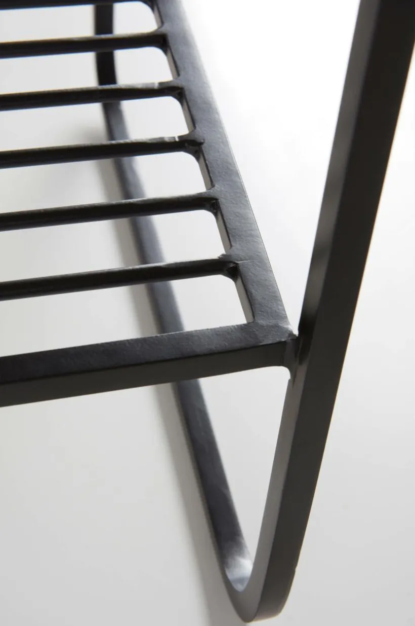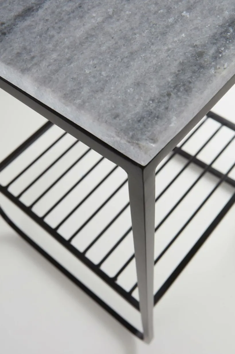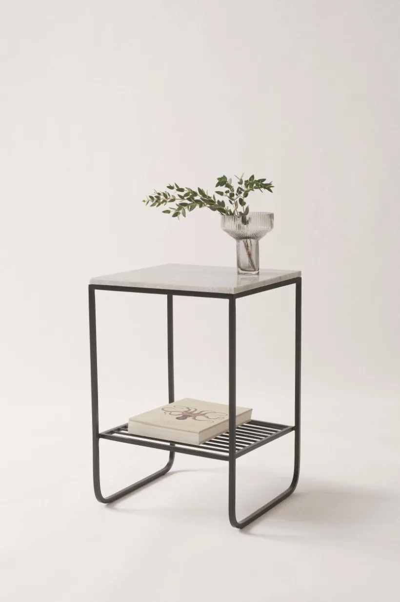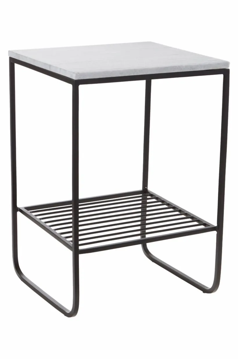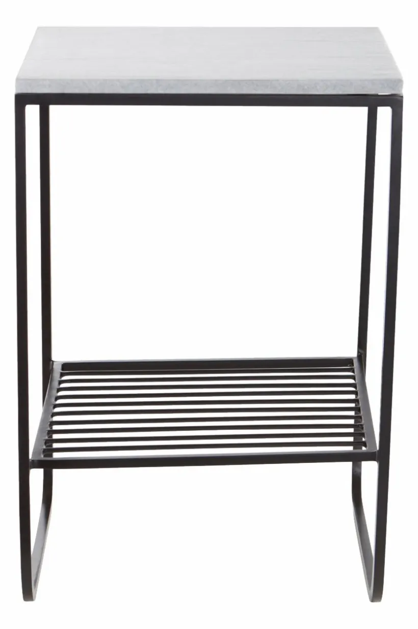 Sidobord av järn med mattlackerad yta. Bordet har en fin bordsskiva av marmor och en hylla under som ger praktisk förvaring. Det gör sig fint bredvid soffan i vardagsrummet men är också ett utmärkt sängbord. Stommen är av fyrkantsprofil och benen är dekorativa där de gör en rundad sväng så bordet står som på medar. Marmor är en natursten och mönstret varierar alltid lite beroende på bergartens sammansättning, vilket gör varje möbel unik.