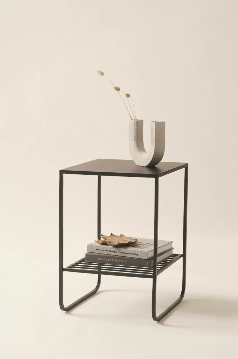 Sidobord av järn med mattlackerad yta. Bordet har en hylla under som ger praktisk förvaring. Det gör sig fint bredvid soffan i vardagsrummet men är också ett utmärkt sängbord. Stommen är av fyrkantsprofil och benen är dekorativa där de gör en rundad sväng så bordet står som på medar.