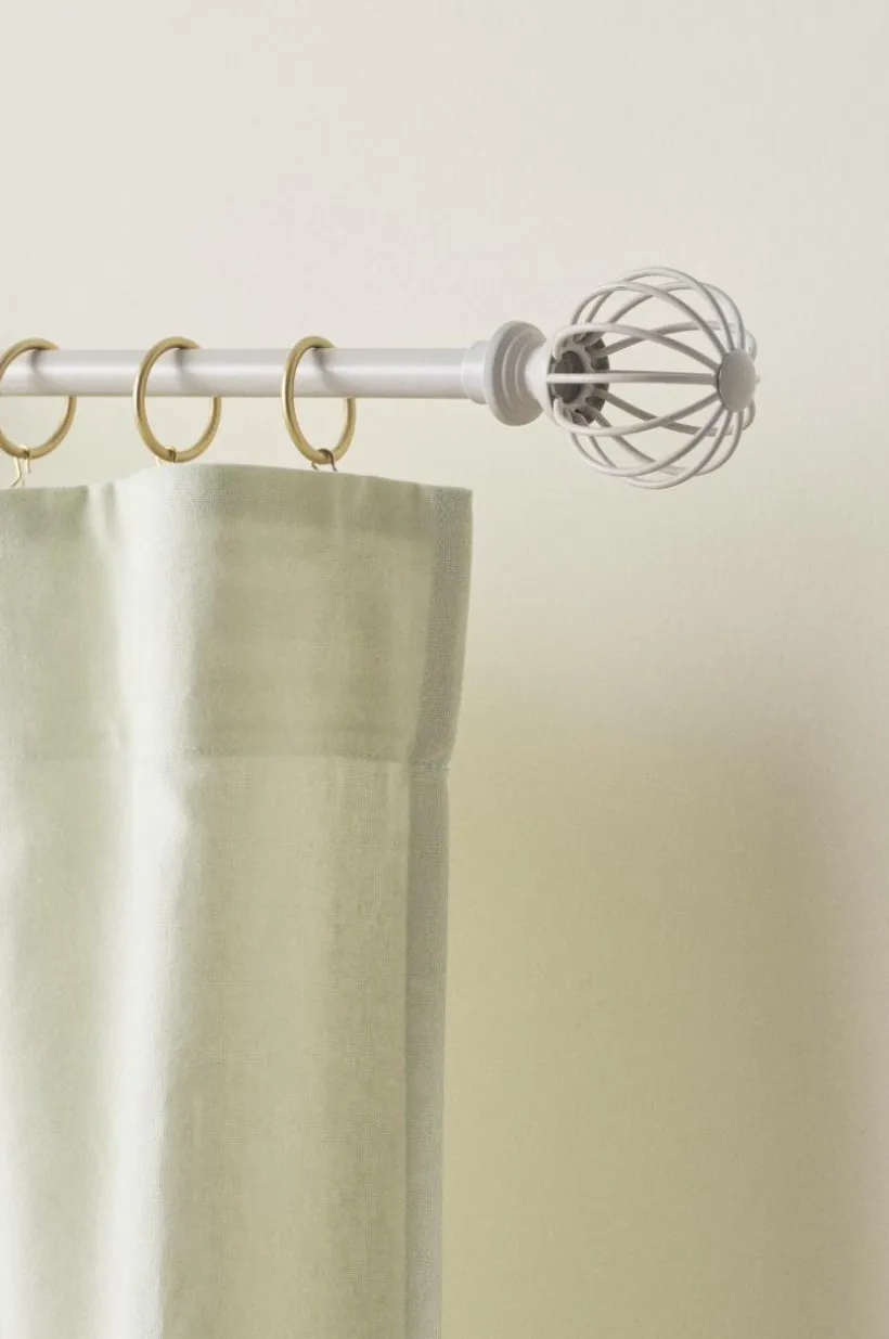 Gardinstång av järn och stål. NULA har en skir, luftig ändknopp i vardera änden, som ger ett nätt intryck. Knopparna skruvas på gardinstången. 3 väggfästen, plugg och skruvar ingår.