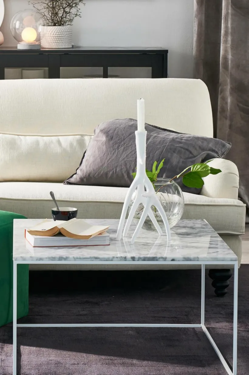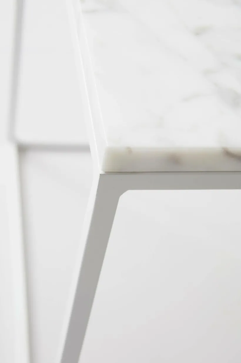 Soffbord med marmorskiva på pulverlackad metallstomme. I tidlös design med spännande materialmix av massiv marmor och lackad metall, får du ett bord som du har glädje av i många år framöver. Marmor är en natursten och mönstret varierar alltid lite beroende på bergartens sammansättning, vilket gör varje möbel unik. Bordet kräver viss montering. Monteringsanvisning medföljer.