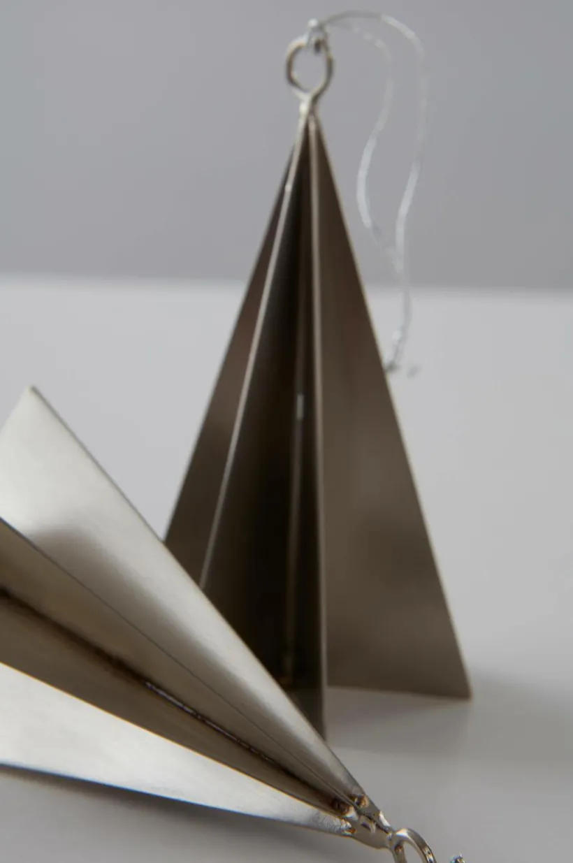 2-pack med dekorationer av stål. De stilistiska granarna har ögla och snöre upptill så du kan hänga dem i ett fönster, i julgranen eller där du vill dekorera lite extra.