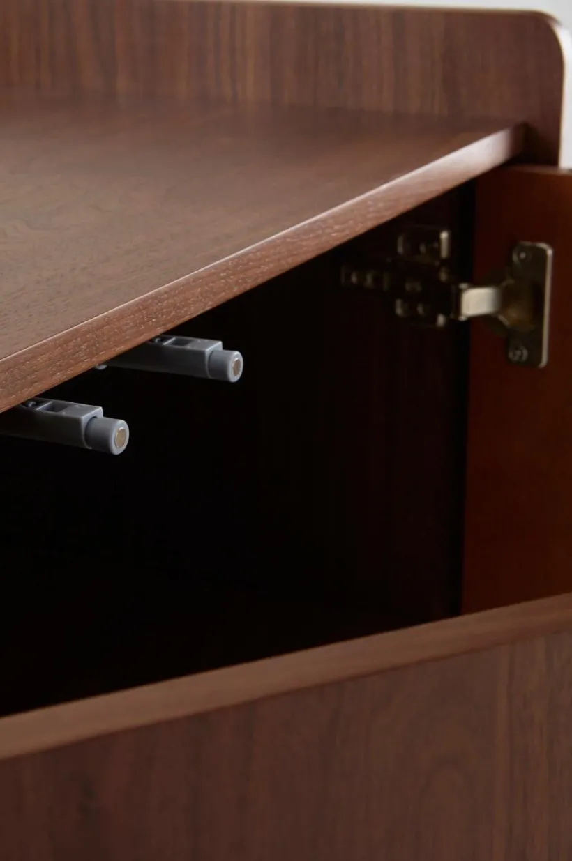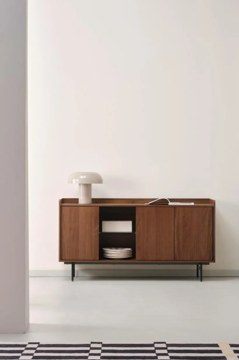 Sideboard ÖRGRYTE lyfter ditt vardagsrum med sin moderna design. Detta sideboard är tillverkat av fanerad MDF med järnben. Fyra fack med eleganta glashyllor och tre infällda dörrar ger bra förvaring och ett snyggt utseende. Perfekt för att organisera elektronik eller visa upp dekor. Denna möbel är mångsidig och passar även bra i ditt sovrum eller på kontoret. Du öppnar och stänger dörrarna med en tryckfunktion.