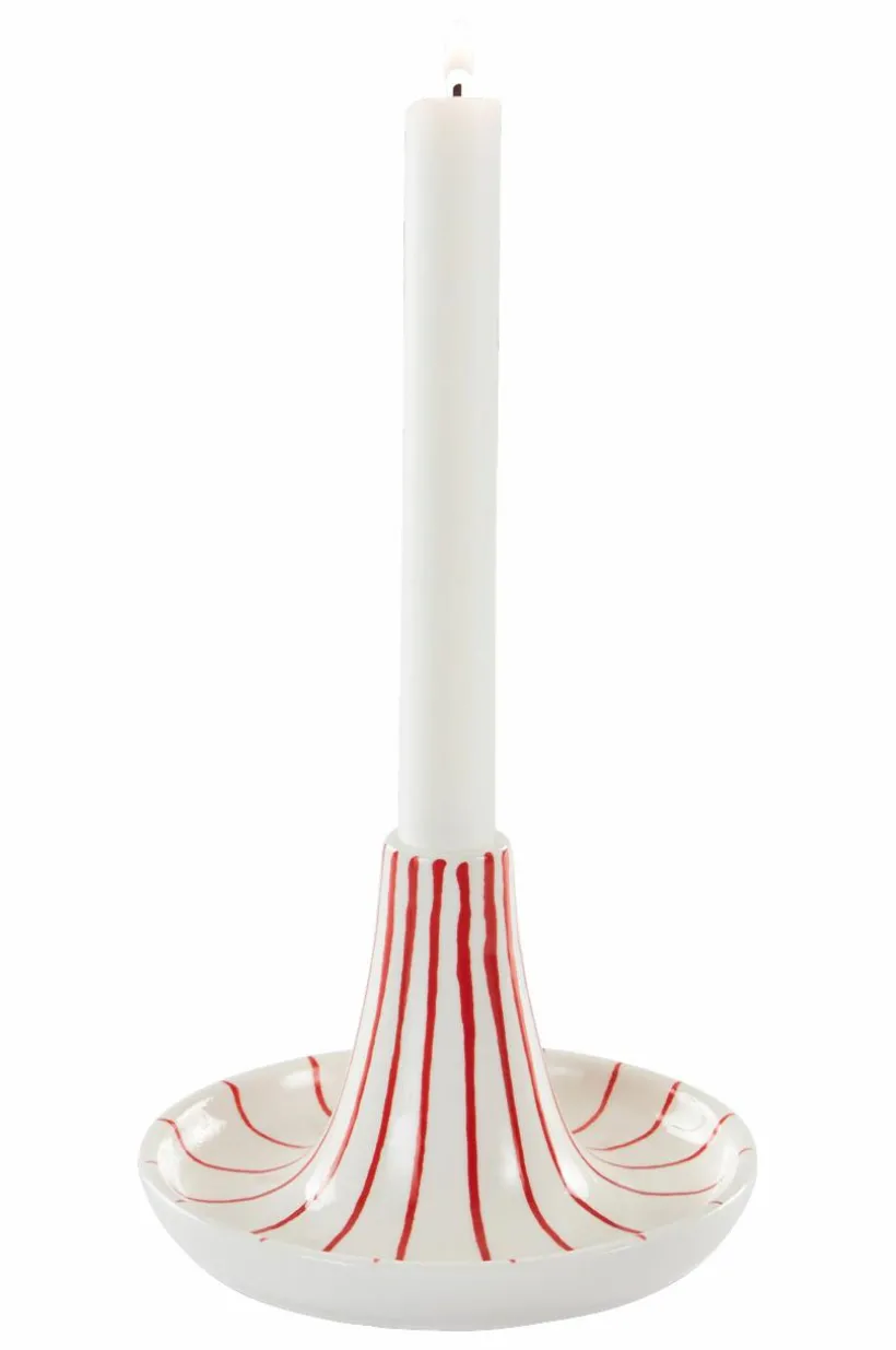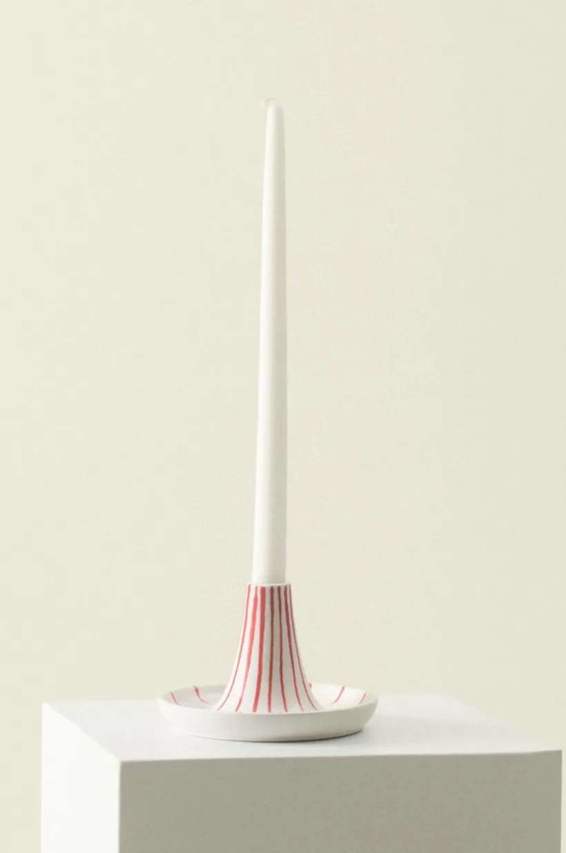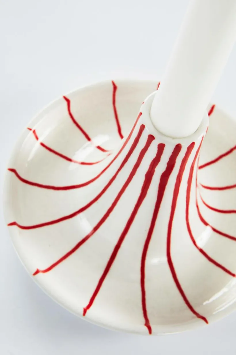 Handgjord ljusstake av keramik. Ljusstaken är klassisk i formen och den har fått en fräsch randig glasyr. Ljusstakens form är mycket praktiskt till ljus som tenderar att rinna när de brinner. Stearinet kan få rinna, stelna vackert utmed ljuset och samlas upp i det lilla fatet istället för att rinna ut på duken. Ljus medföljer ej.