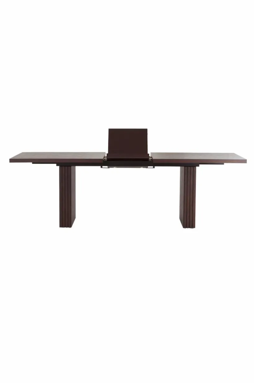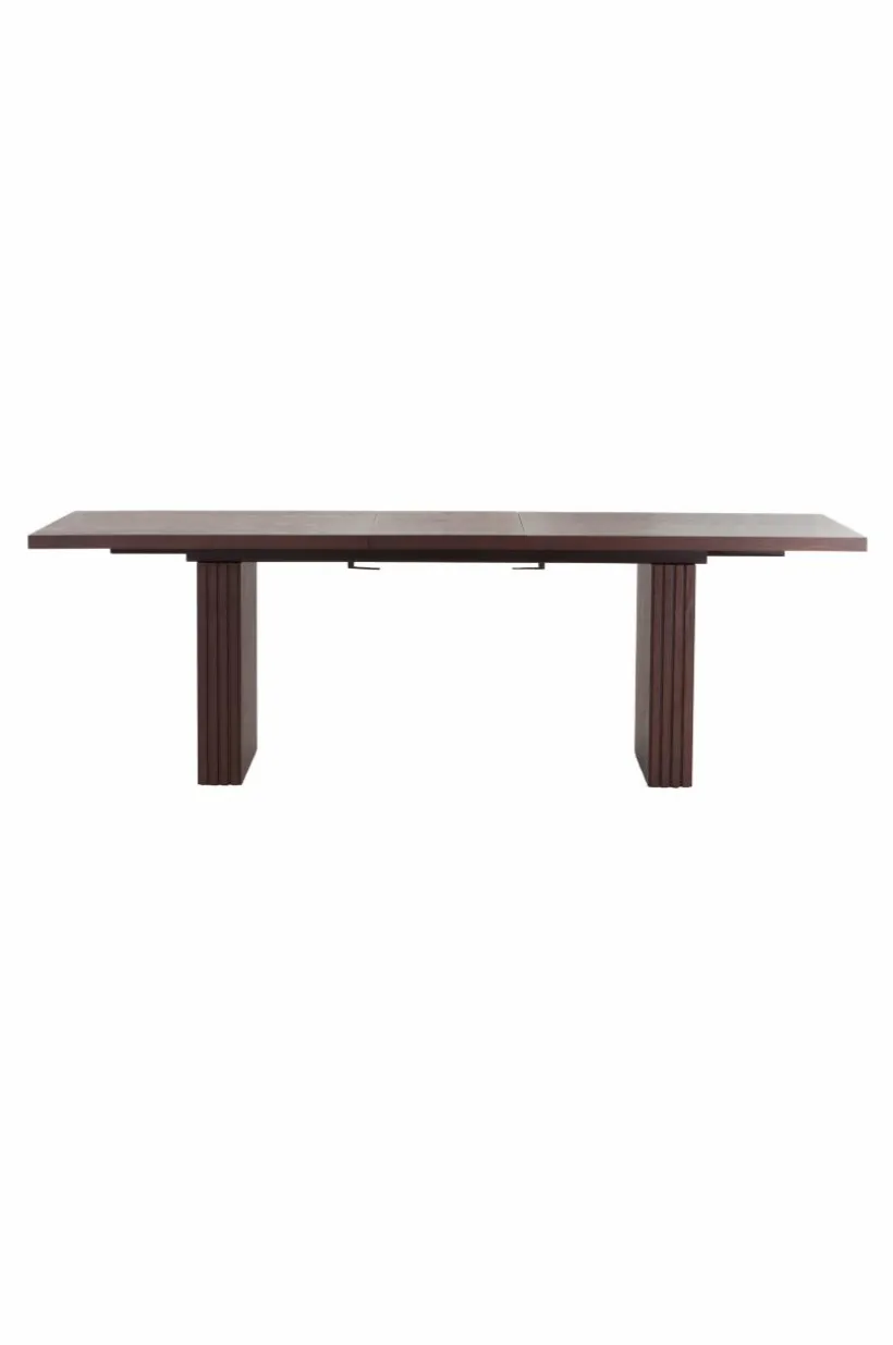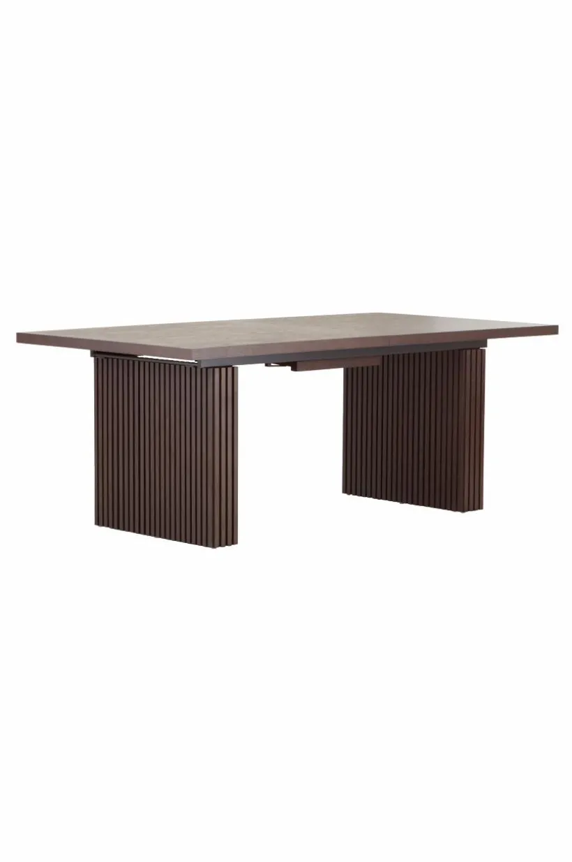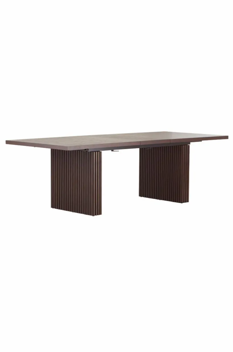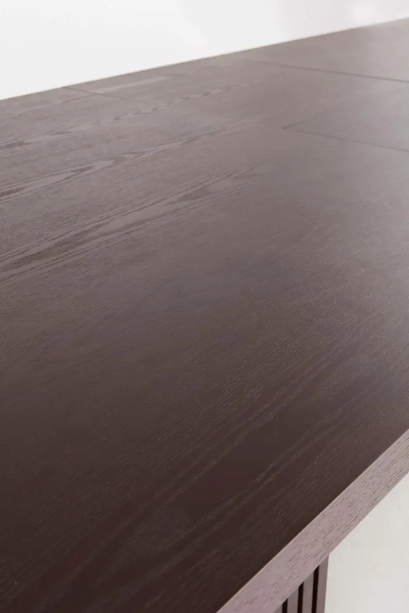Matbord i MDF med askfaner. Det rejäla matbordet har smidig utdragsfunktion med iläggsskiva som ger dig plats för fler när vännerna tittar in. Iläggsskivan viks ned och förvaras i bordet när den inte används, praktiskt och enkelt. De två robusta bordsbenen har urfrästa, vertikala ränder som ger en klassisk känsla med retroinslag. Bordet är stort och stilrent med kantig bordsskiva och mjukt rundade hörn på benen. PALANZO är ett flexibelt och stilfullt bord som kommer att ge ditt rum attityd. Skruvar ingår. Viss montering krävs.