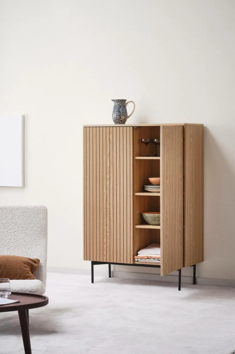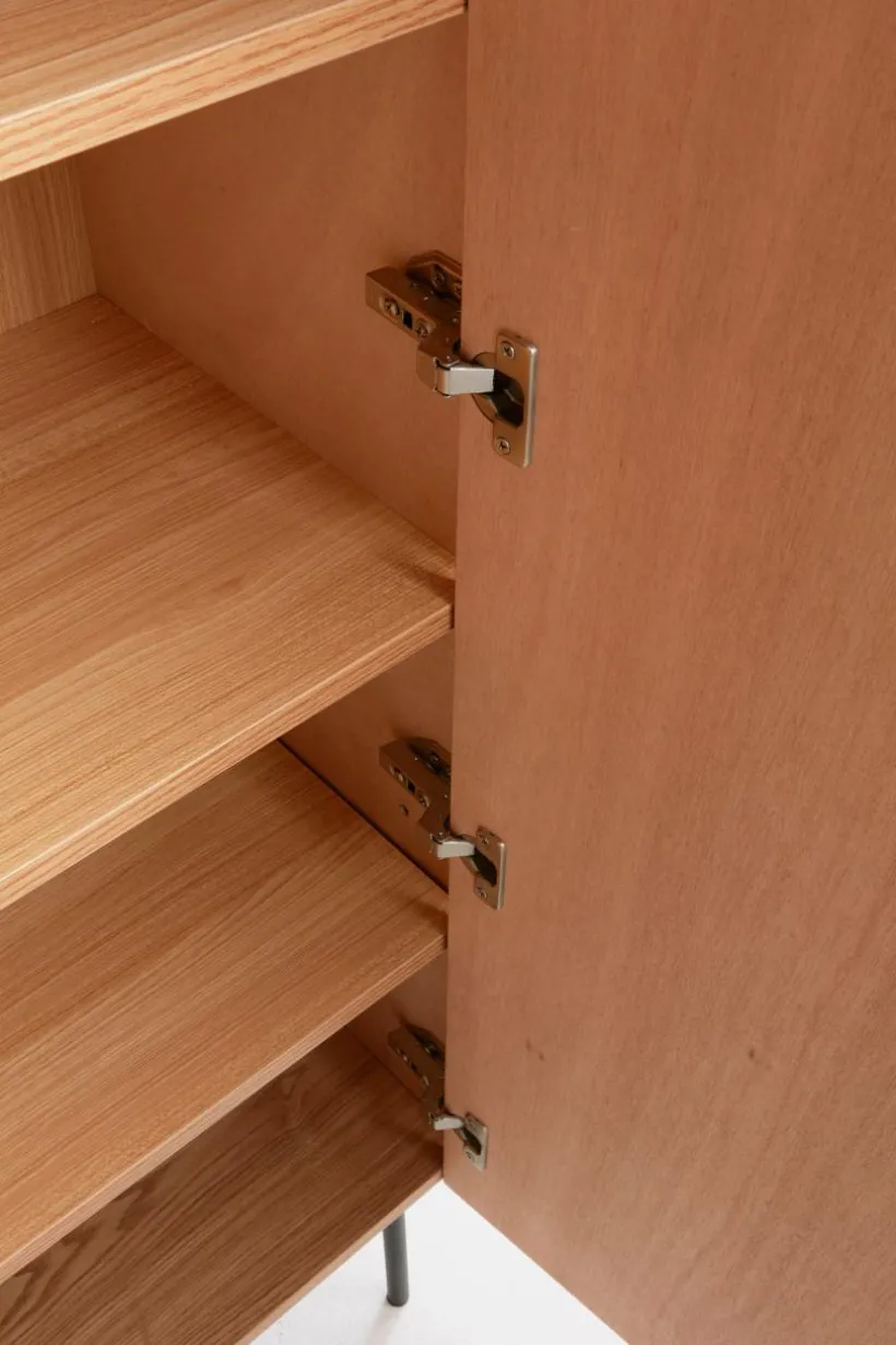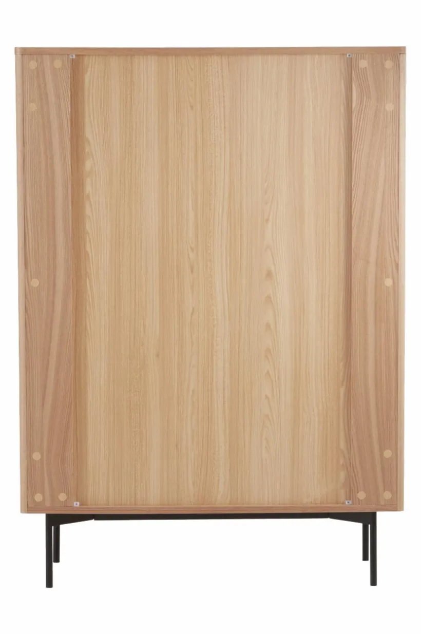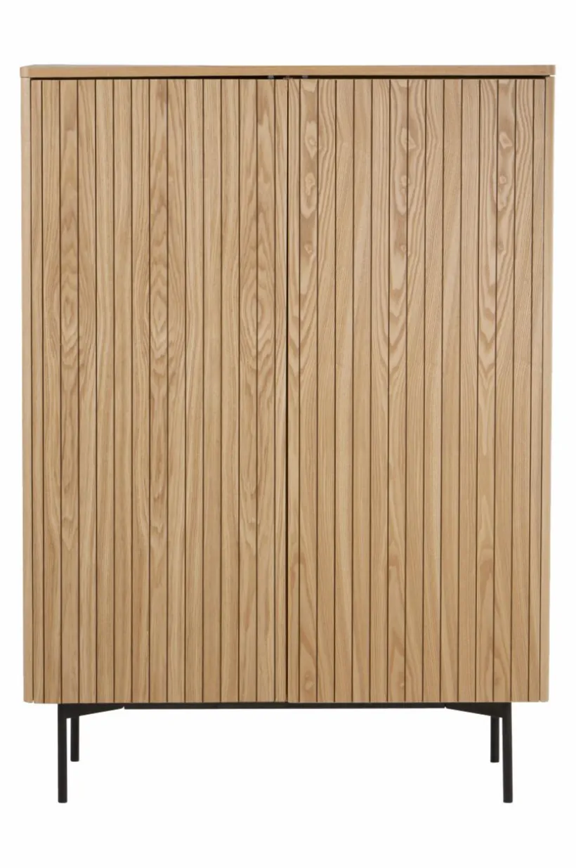 Skåp i MDF med askfaner. Skåpet har urfrästa, vertikala ränder som ger en klassisk känsla med retroinslag. Skåpet är stilrent med mjukt rundade hörn och dörrarna öppnas med pushfunktion, det vill säga att du trycker dörren mjukt inåt för att öppna och stänga. Skåpet har tre fasta hyllplan. De raka stålbenen är pulverlackerade. PALANZO är ett stilfullt skåp som kommer att ge ditt rum attityd, samtidigt som du får praktisk förvaring dold bakom dörrarna. Väggfäste ingår. Skruvar ingår. Viss montering krävs. Monteringsanvisning medföljer.