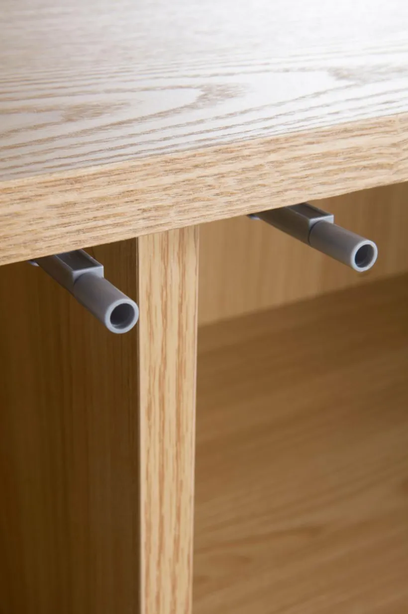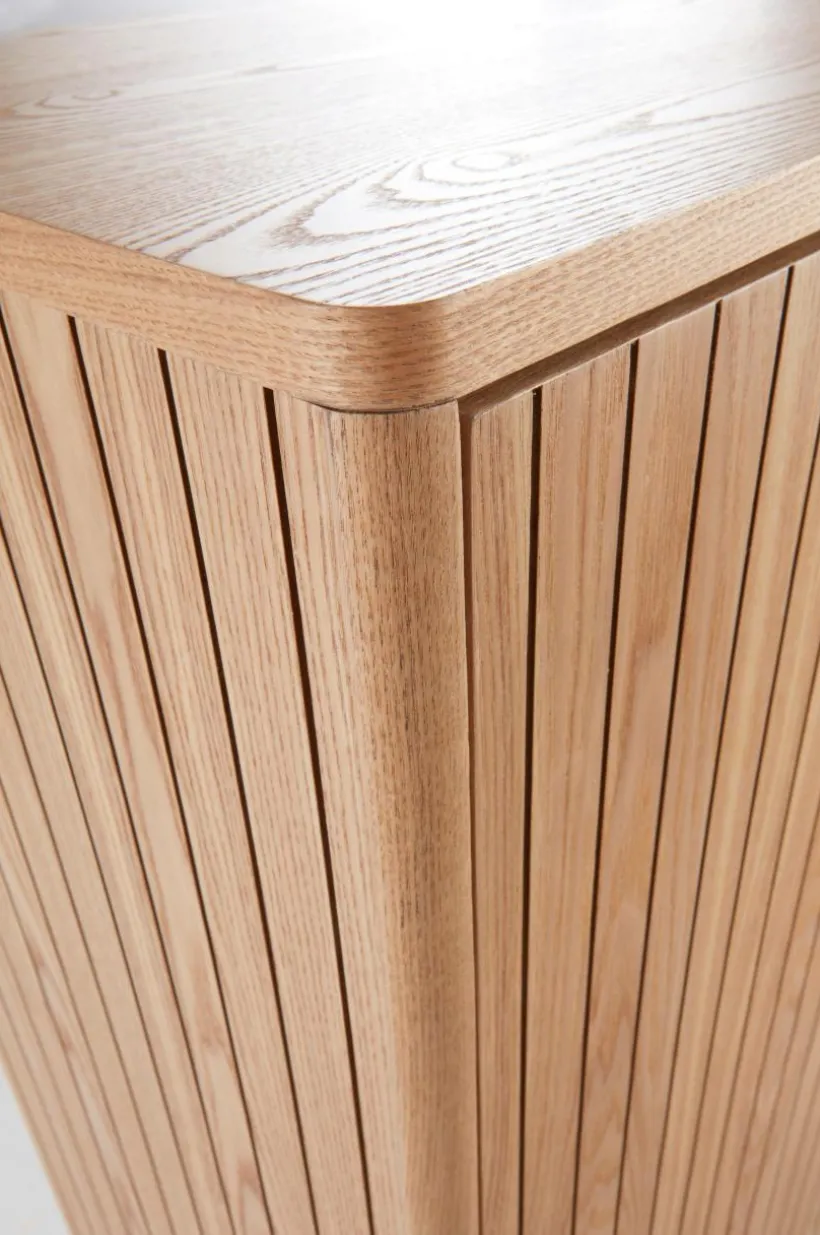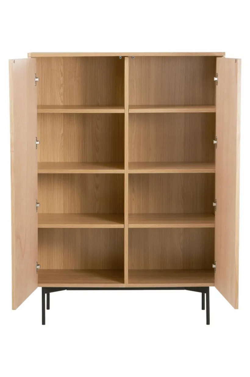 Skåp i MDF med askfaner. Skåpet har urfrästa, vertikala ränder som ger en klassisk känsla med retroinslag. Skåpet är stilrent med mjukt rundade hörn och dörrarna öppnas med pushfunktion, det vill säga att du trycker dörren mjukt inåt för att öppna och stänga. Skåpet har tre fasta hyllplan. De raka stålbenen är pulverlackerade. PALANZO är ett stilfullt skåp som kommer att ge ditt rum attityd, samtidigt som du får praktisk förvaring dold bakom dörrarna. Väggfäste ingår. Skruvar ingår. Viss montering krävs. Monteringsanvisning medföljer.