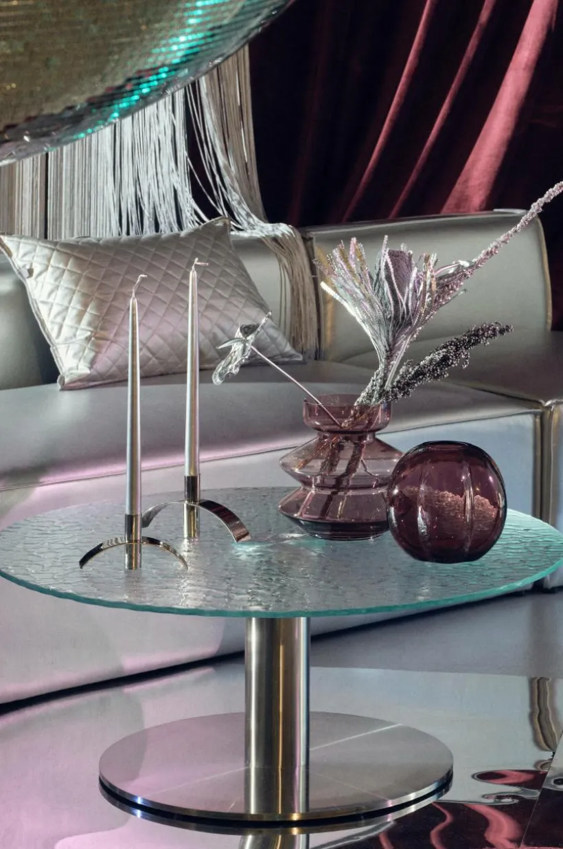 Runt matbord med bordsskiva i bubbligt glas och pelarfot av rostfritt stål med borstad yta. Foten är rak och stilren och skapar snygg kontrast till bordsskivan i bubbligt glas. Den låga höjden på bordet ger skön loungekänsla vid soffan. Viss montering krävs. Monteringsanvisning medföljer.
