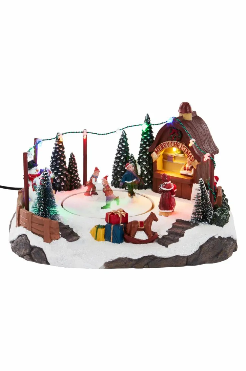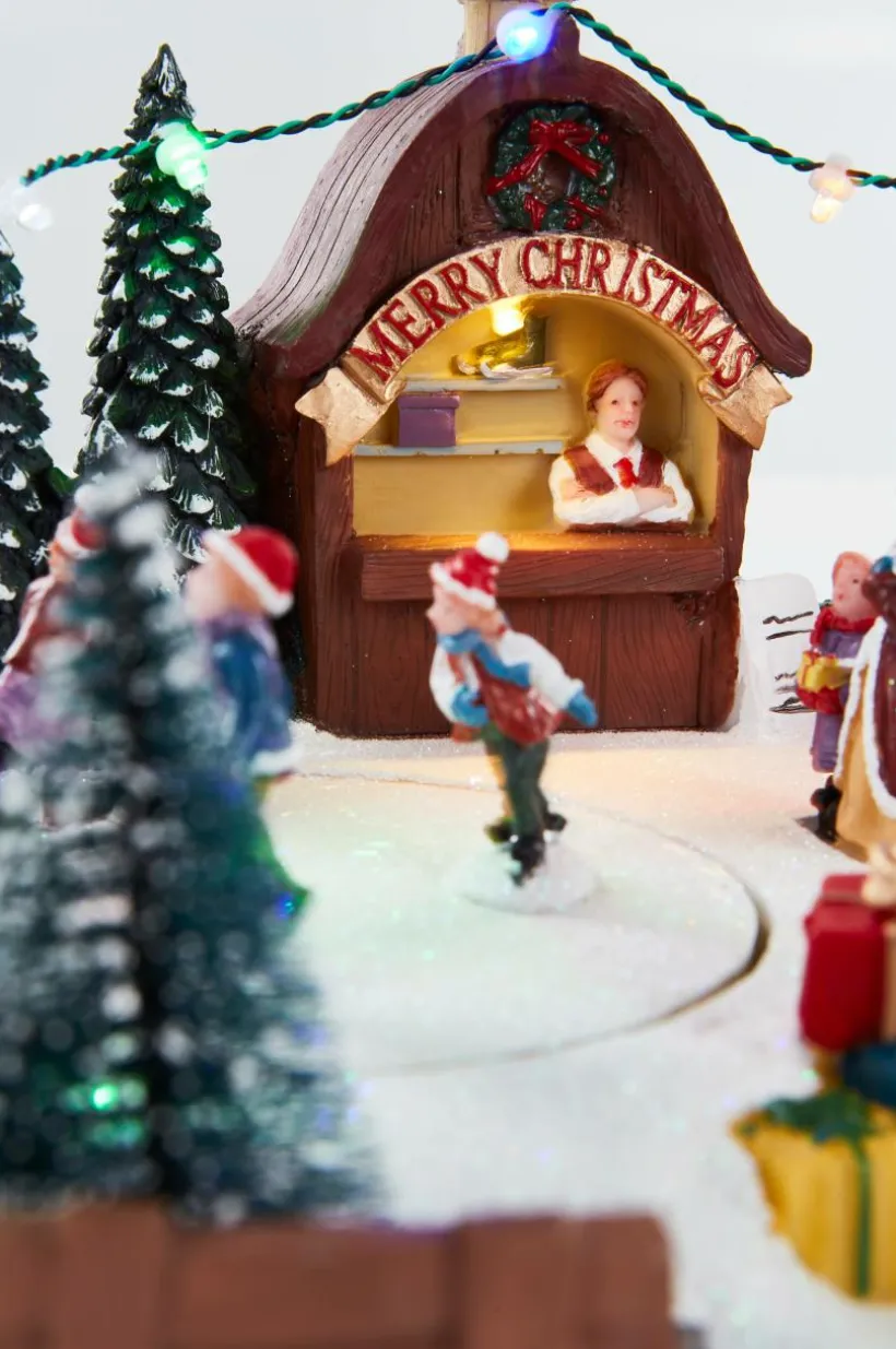 Stämningsfull dekoration till jul eller advent med en lite skridskobana som roterar och spelar musik. Vid banan står en snögubbe och en lite ljusslinga lyser fint över skridskobanan. Produkten driv av batteri och har timerfunktion. Placera på ett bord eller en hylla för en härlig julstämning. 3 batterier AA ingår ej.
