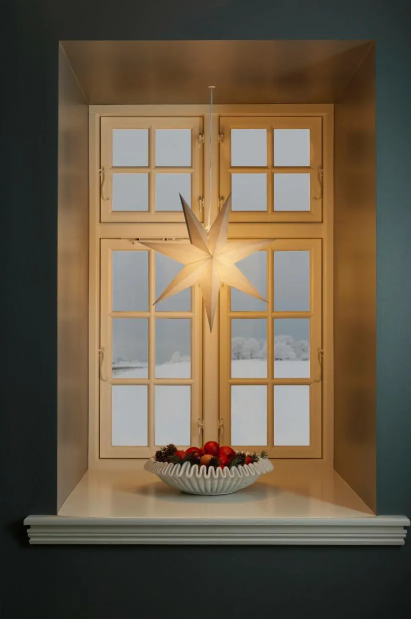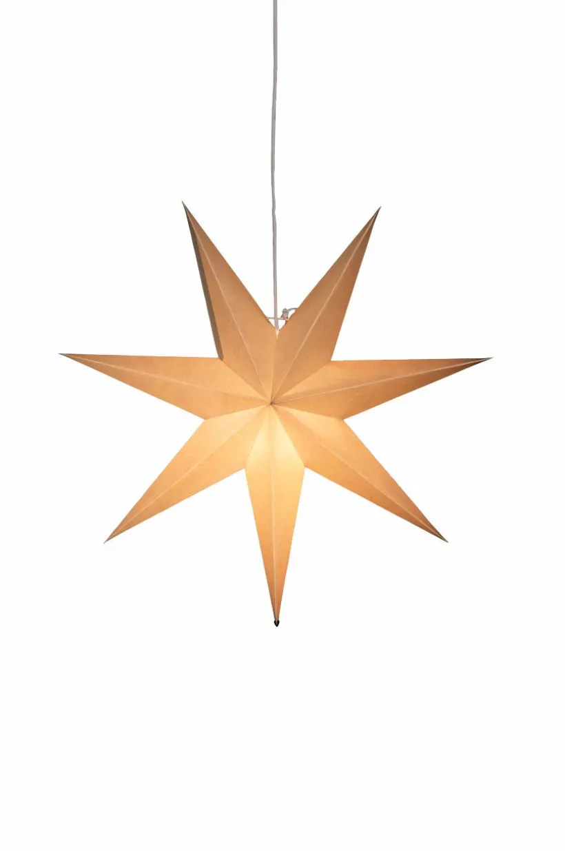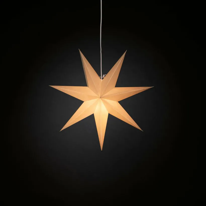 Hängande pappersstjärna med 7 uddar. Sladdställ med 5 meter anslutningssladd ingår, E14-sockel. Sladdströmbrytare. Diameter 60 cm