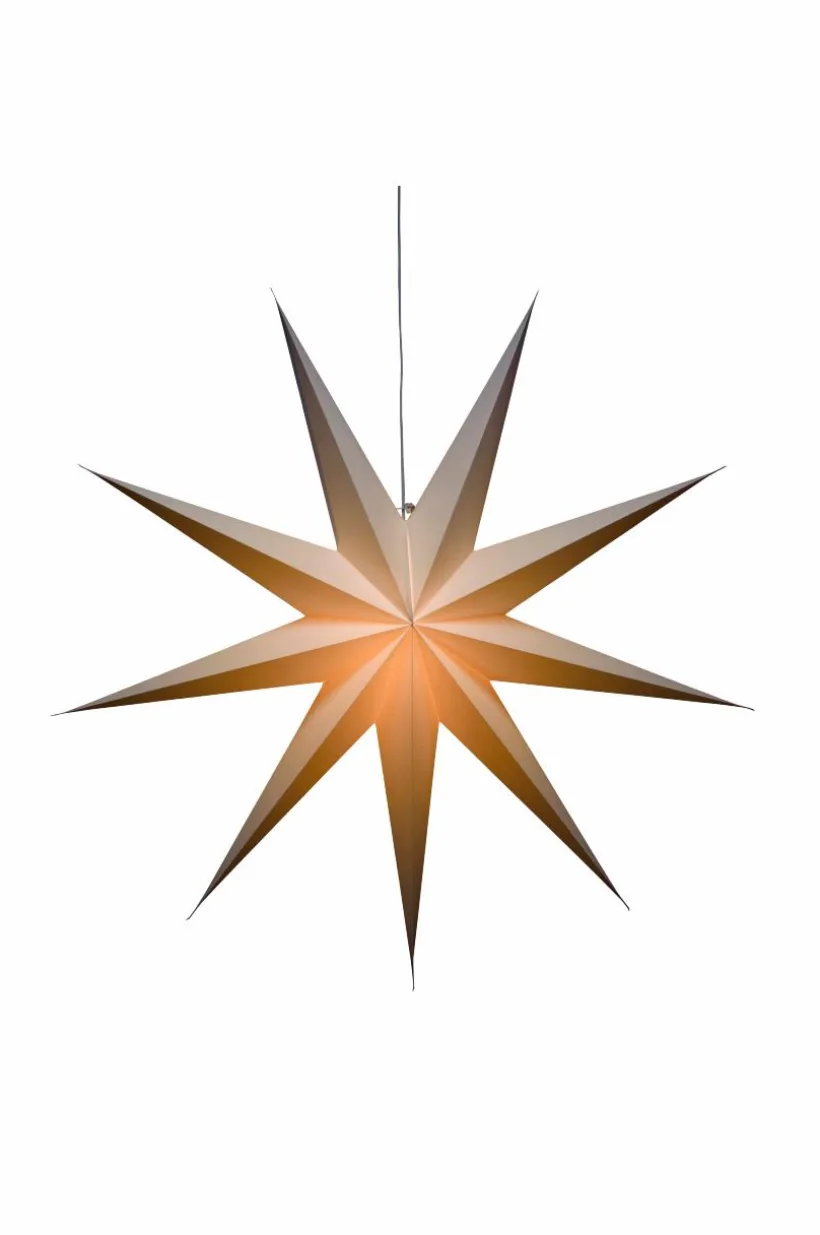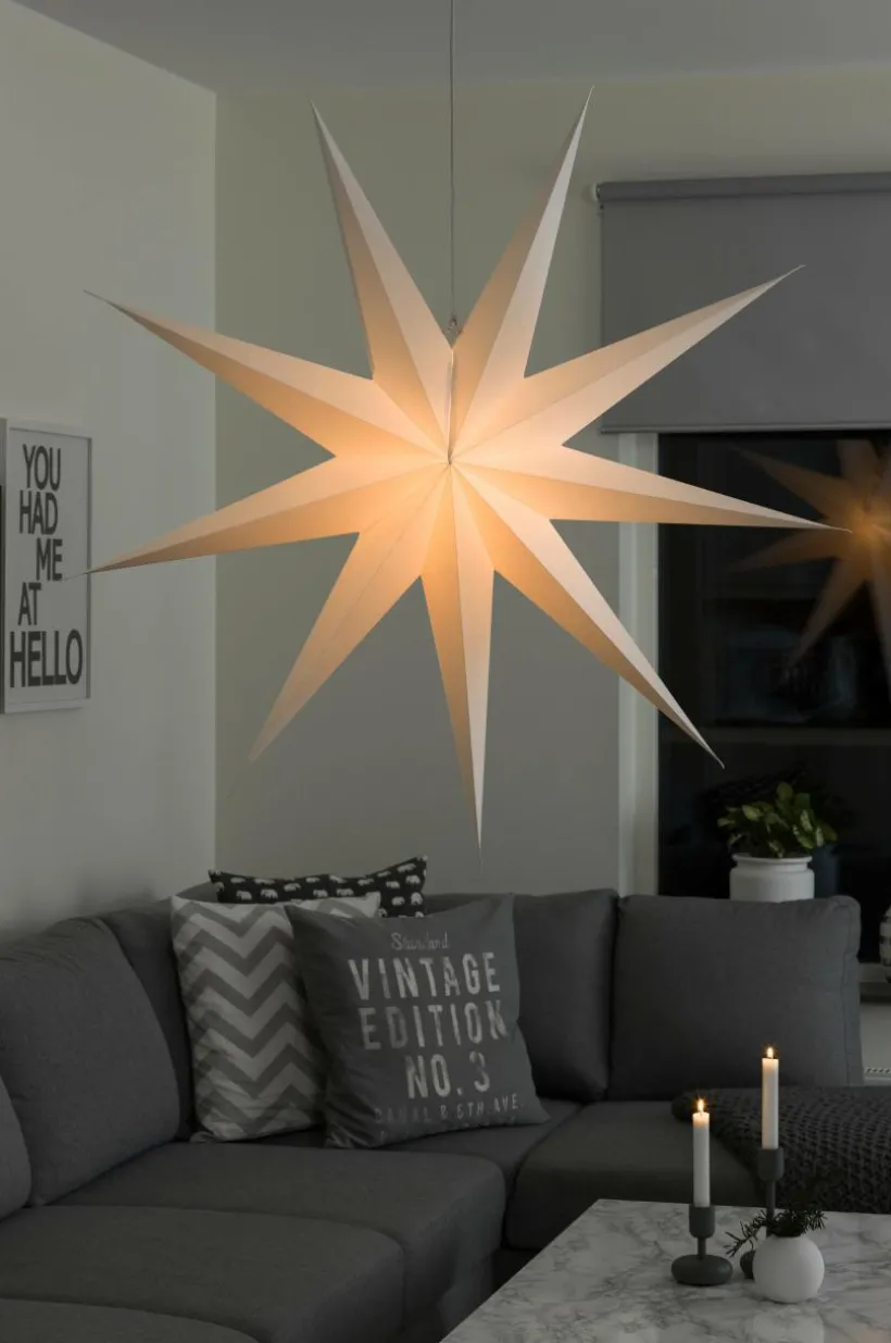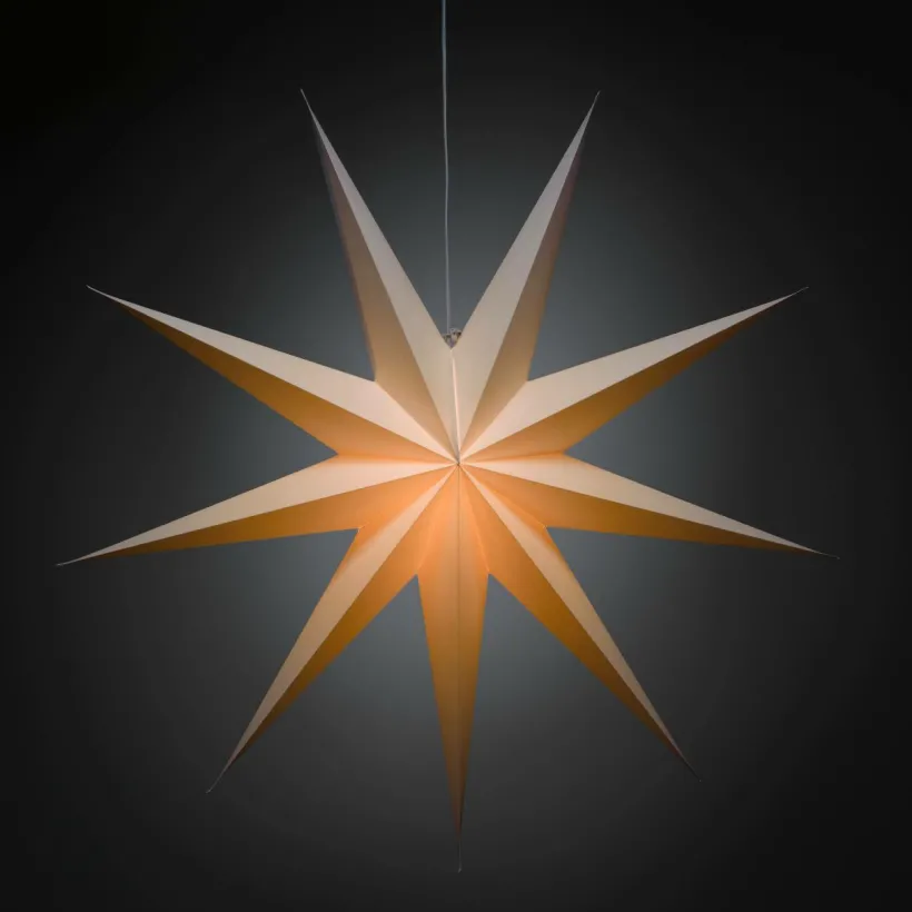 Hängande pappersstjärna med 7 uddar. Sladdställ med 5 meter anslutningssladd ingår, E14-sockel. Sladdströmbrytare. Diameter 115 cm.