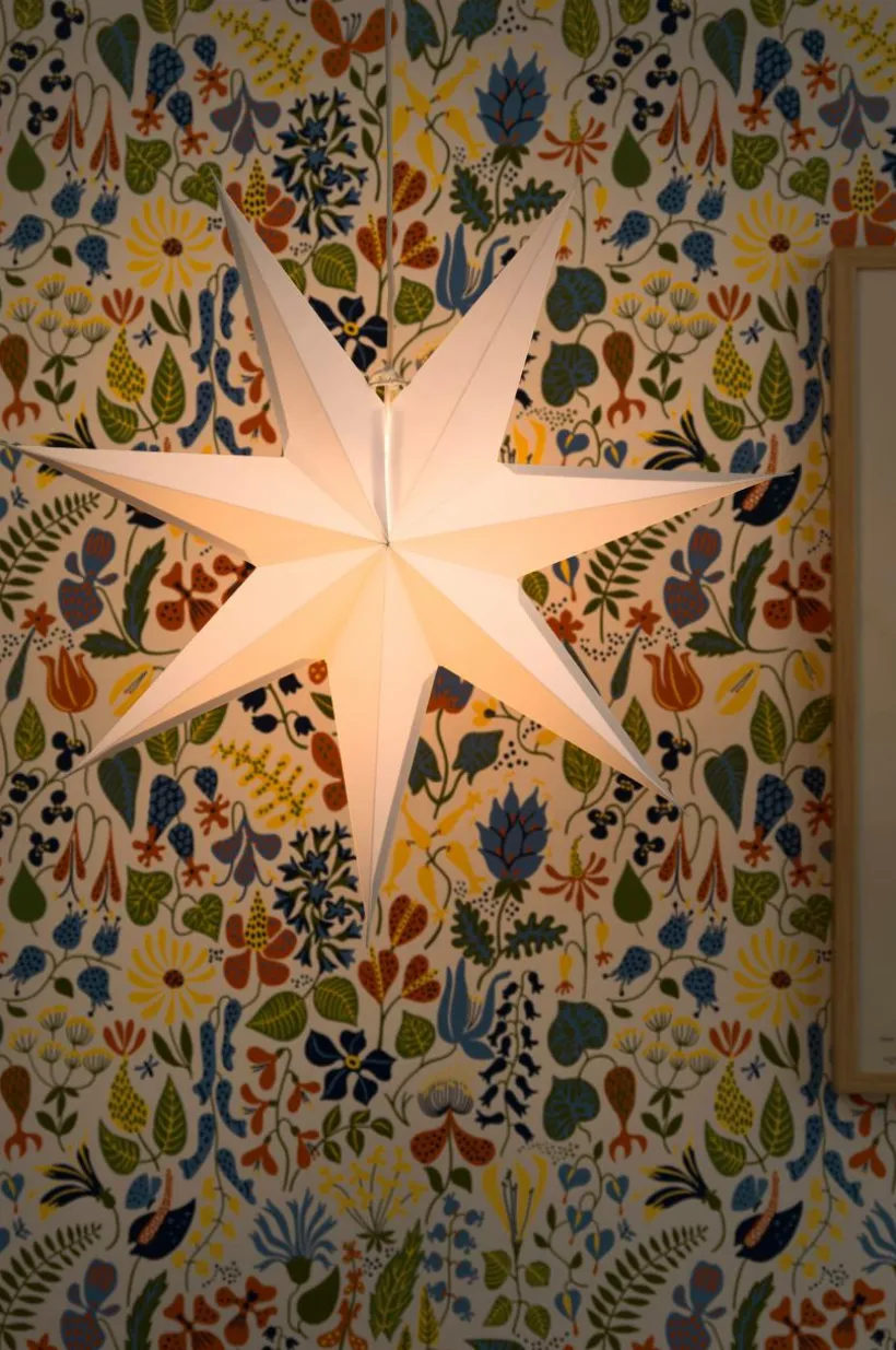 Hängande pappersstjärna med 7 uddar. Sladdställ med 5 meter anslutningssladd ingår, E14-sockel. Sladdströmbrytare. Diameter 60 cm.