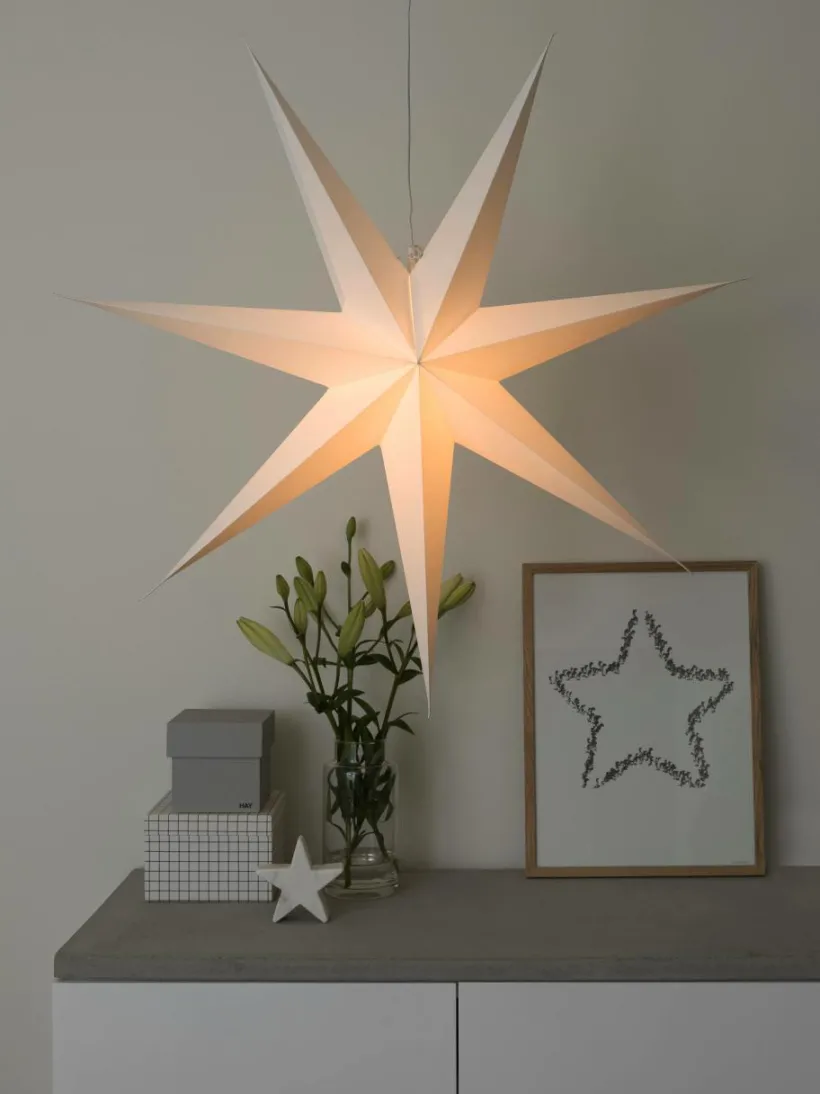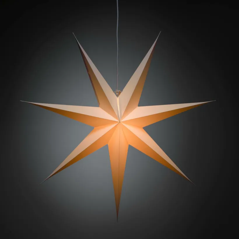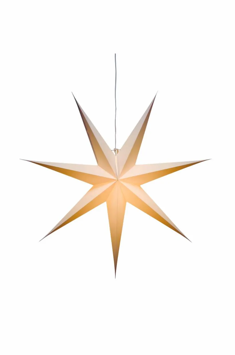 Hängande pappersstjärna med 7 uddar. Sladdställ med 5 meter anslutningssladd ingår, E14-sockel. Sladdströmbrytare. Diameter 78 cm.