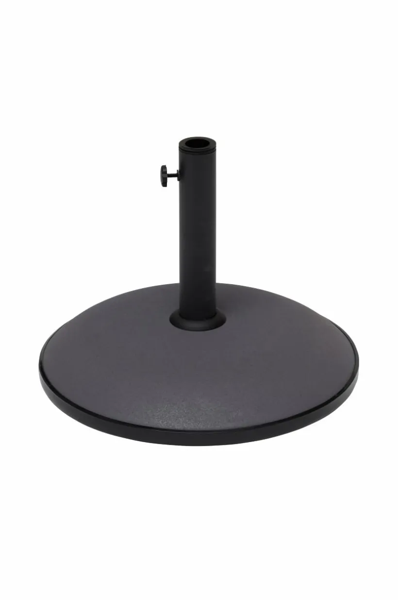 Parasollfot i grå betong. Plasthylsor i röret gör att diametern kan justeras mellan 30 och 40 mm. Plastlisten gör att betongfoten kan förflyttas med mindre risk för repor.