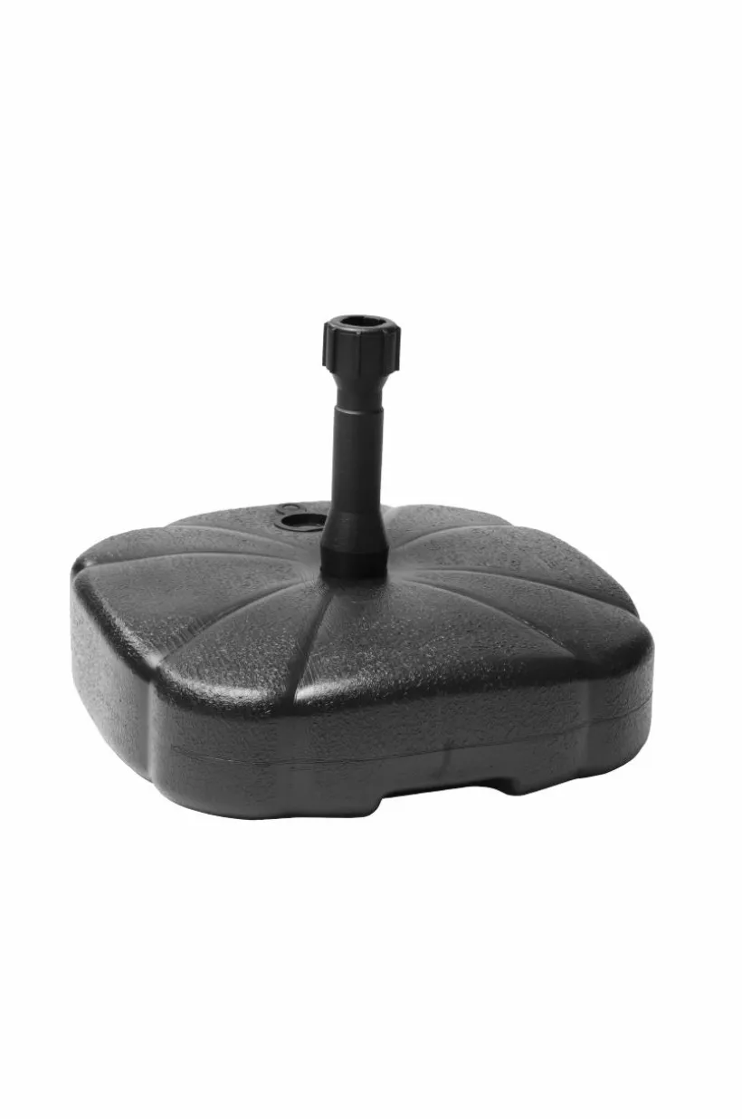 Parasollfot i plast. Kan fyllas med vatten eller sand. Diametern i röret kan justeras till mellan 20 och 35 mm.
