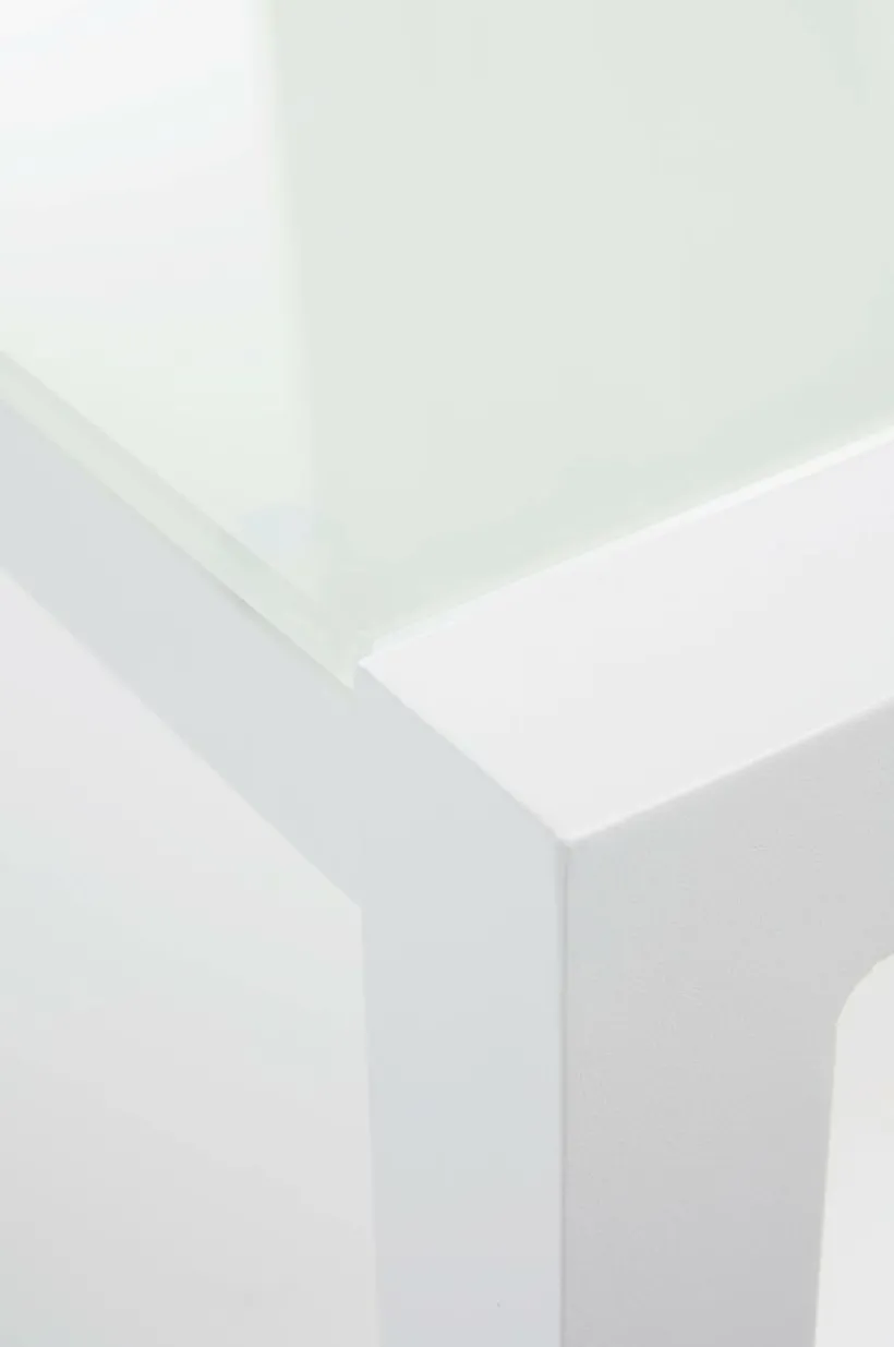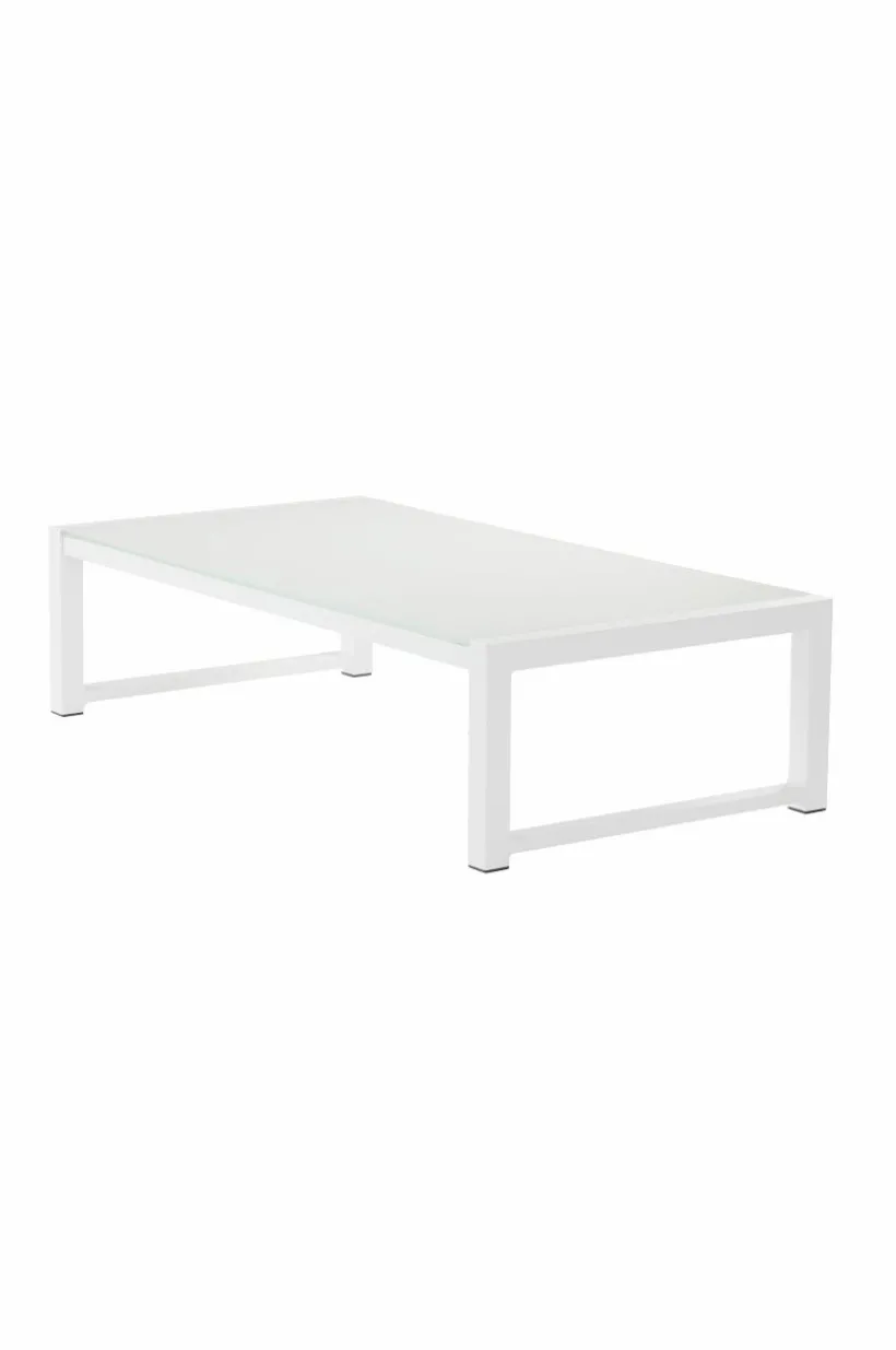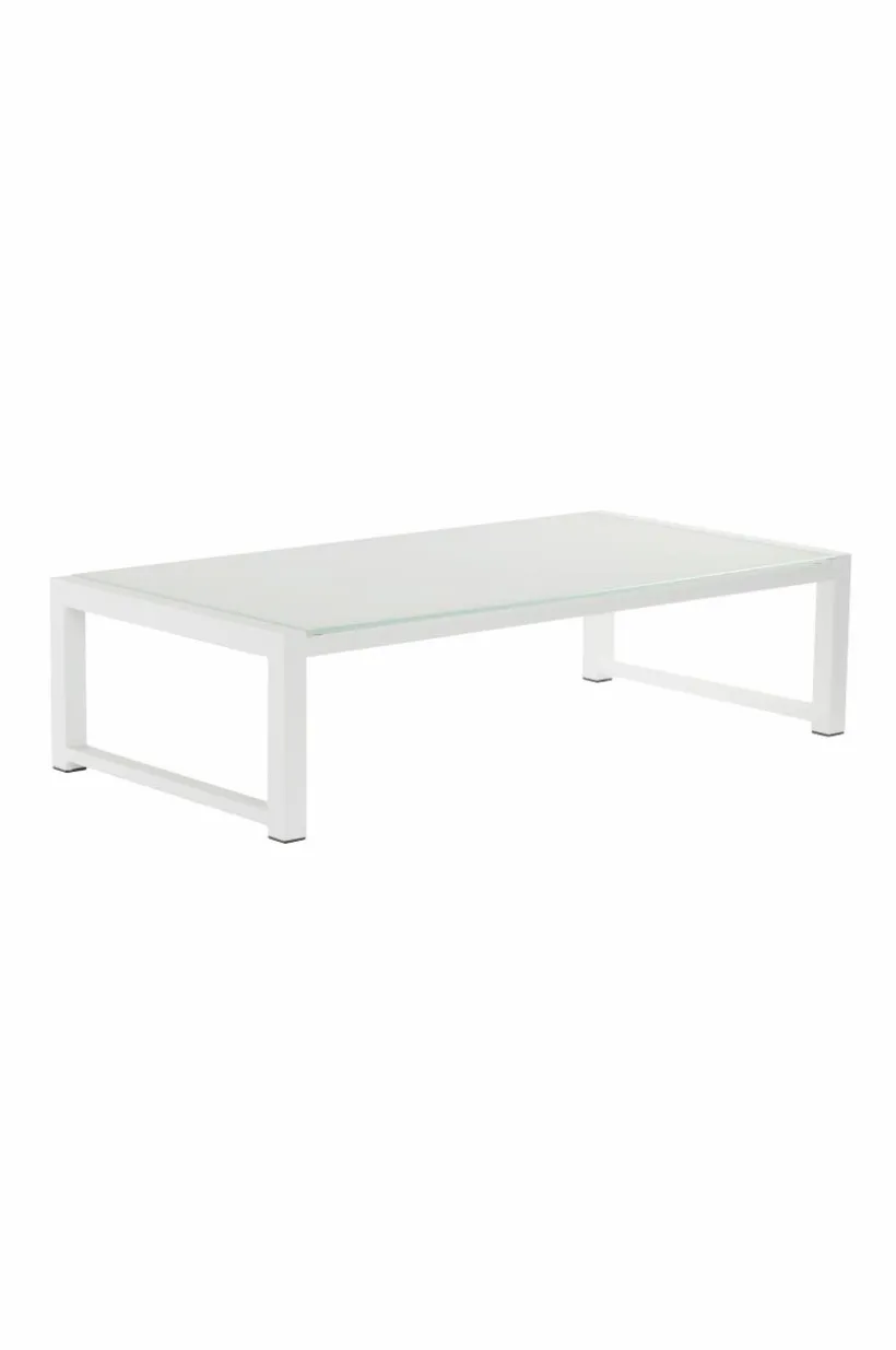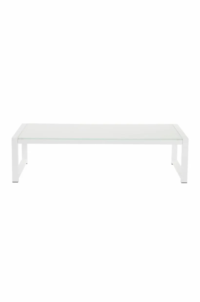 Rektangulärt soffbord med bordsskiva av glas och underrede av pulverlackerad aluminium. Aluminium är ett praktiskt material som har låg vikt och det rostar inte. Du kan låta det stå utomhus. Viss montering krävs.