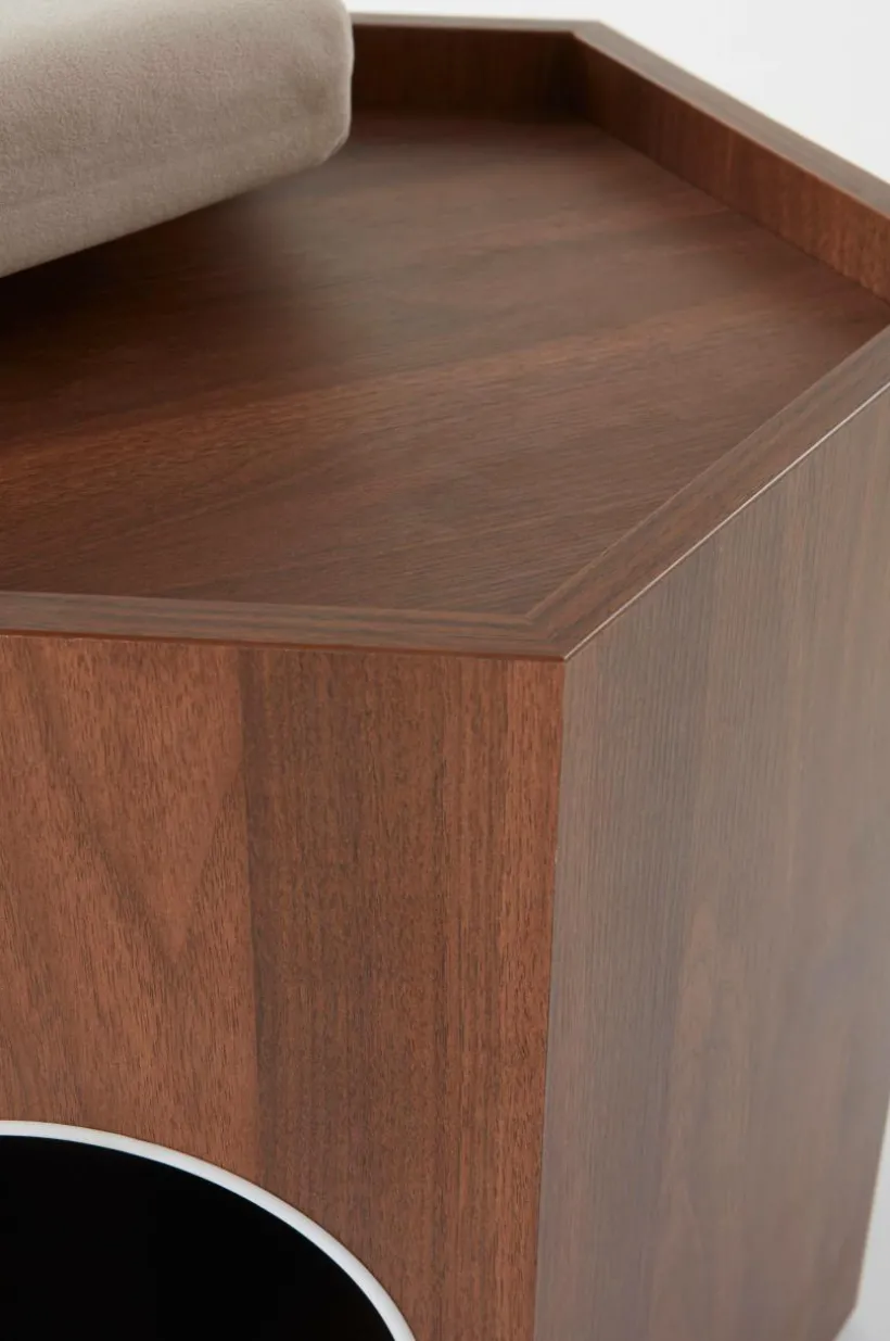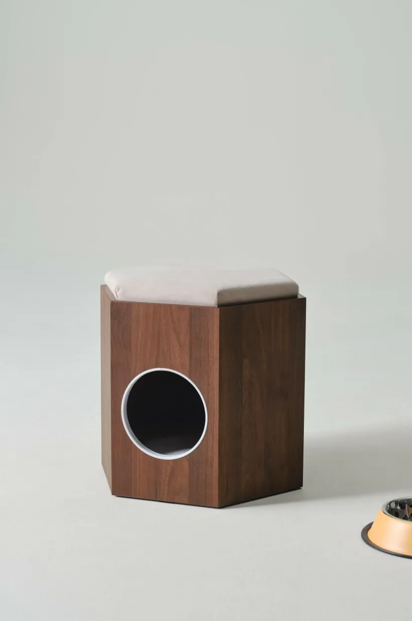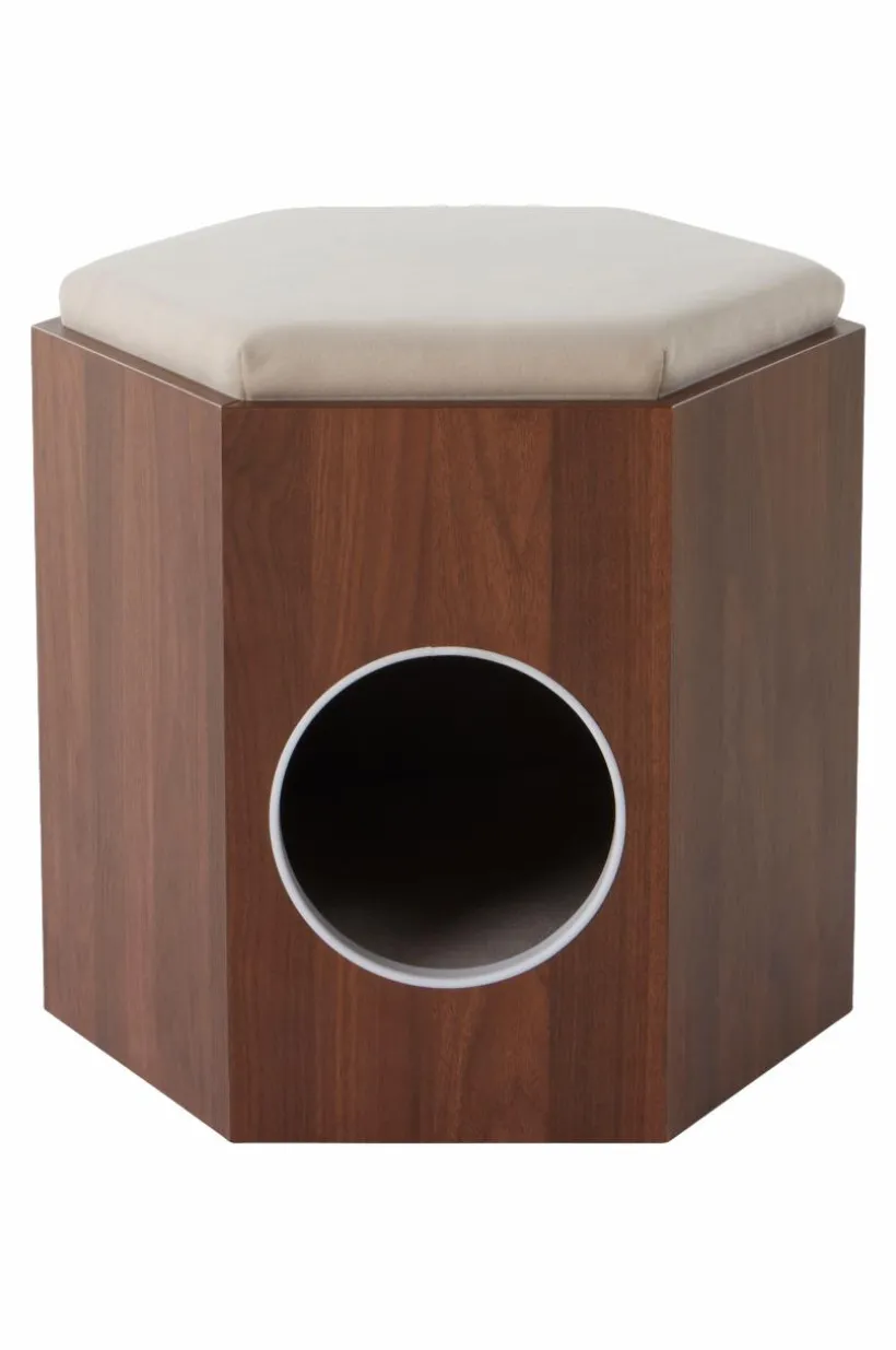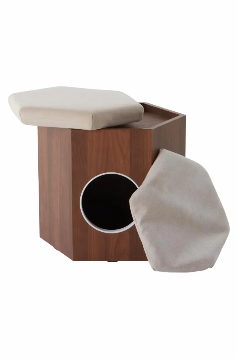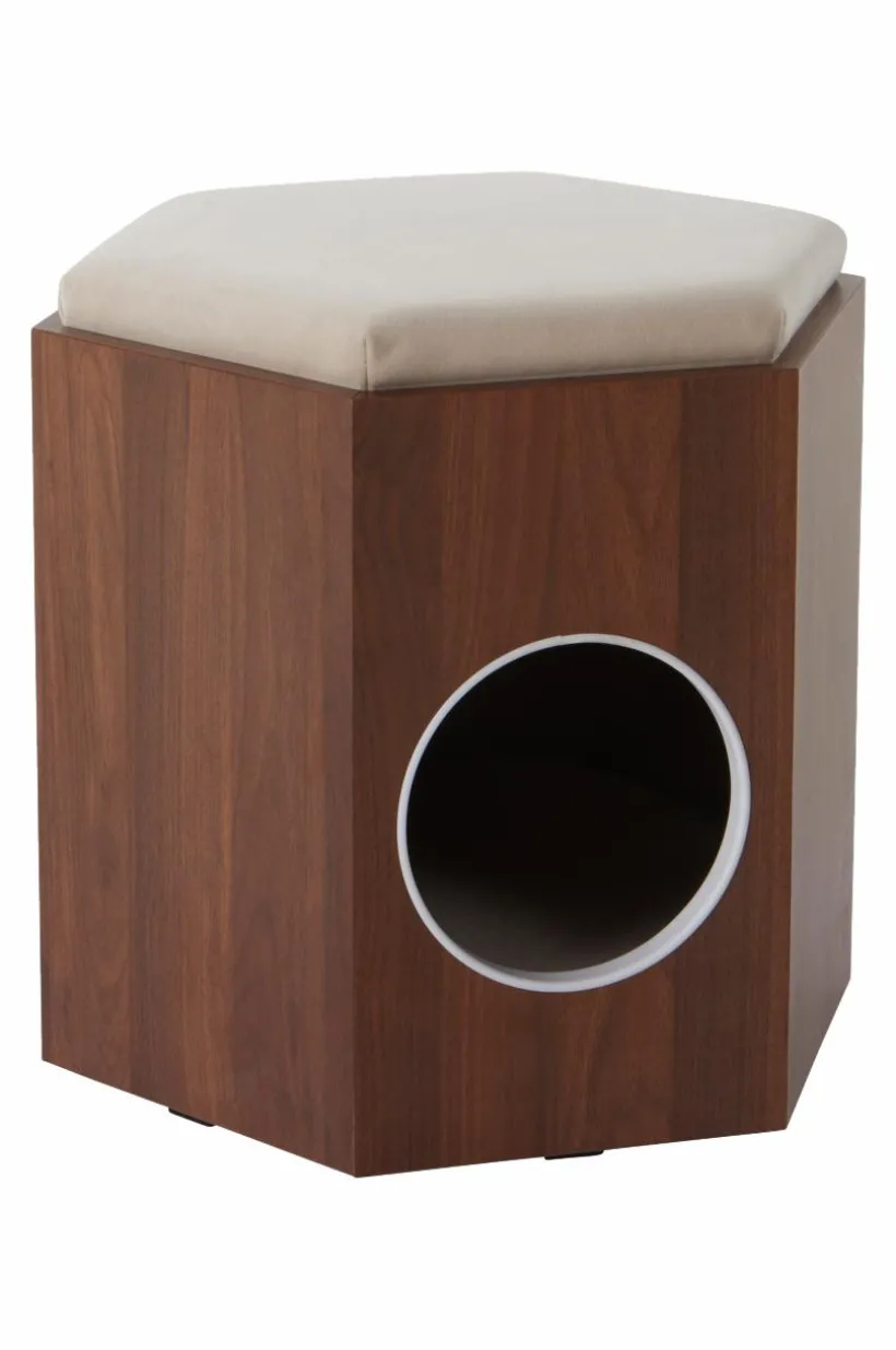 PASTO är en snygg sexkantig pall med en kattbädd i. PASTO ger modern känsla till ditt vardagsrum, sovrum eller hall. Den är utformad för både dig och ditt lilla husdjur och erbjuder en mysig vrå för katter eller små hundar och en bekväm sittplats för dig. Dynan är tillverkad av mjukt skum och har ett slitstarkt polyesteröverdrag. PASTO är tillverkad av MDF och har en elegant fanéryta och är också bra för förvaring av handskar, halsdukar eller husdjurstillbehör i hallen.