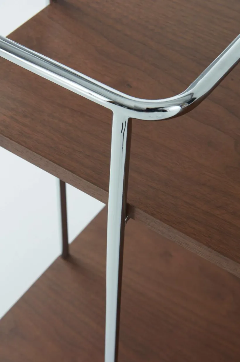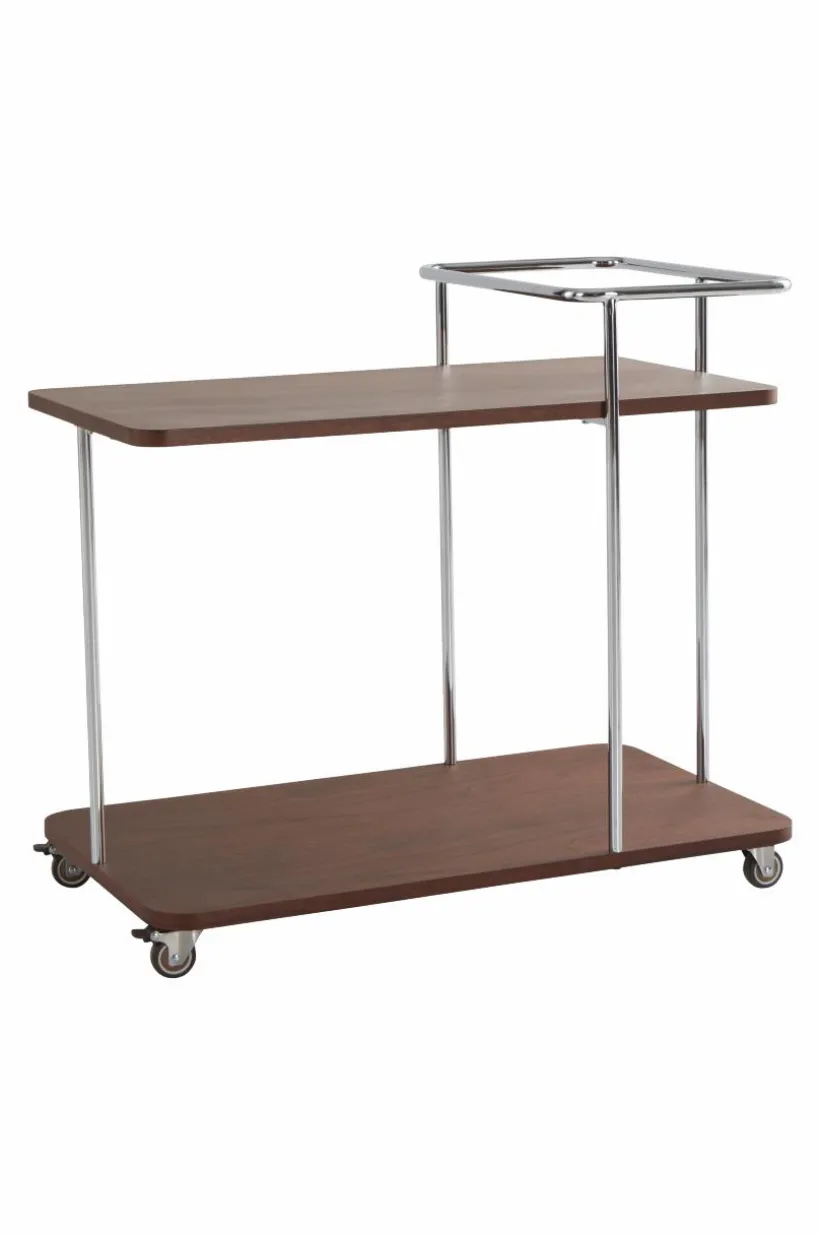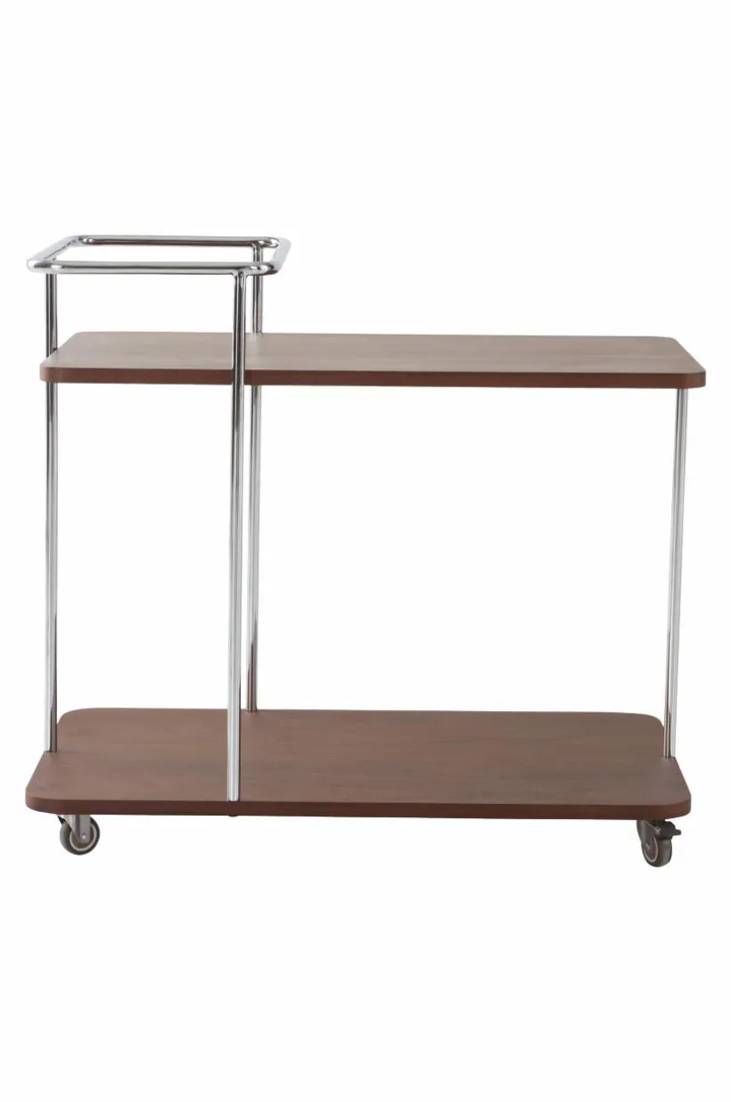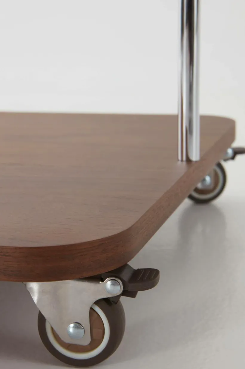 PINGLE är en rullbar serveringsvagn i valnötsfanér. Förvandla ditt vardagsrum eller din matsal med denna eleganta rullbara serveringsvagn. Den är tillverkad av FSC-certifierad MDF med en rik valnötsfanér och har ett robust underrede av järn med en elegant kromfinish. Den har fyra lättrullade hjul, varav två har bromsar för stabilitet, vilket garanterar enkel rörlighet. Avståndet mellan hyllplanen är 49,3 cm. Den övre metallramen har en 11 cm bred skyddskant och 6,5 cm höga hjul, allt för att kombinera funktion och stil.