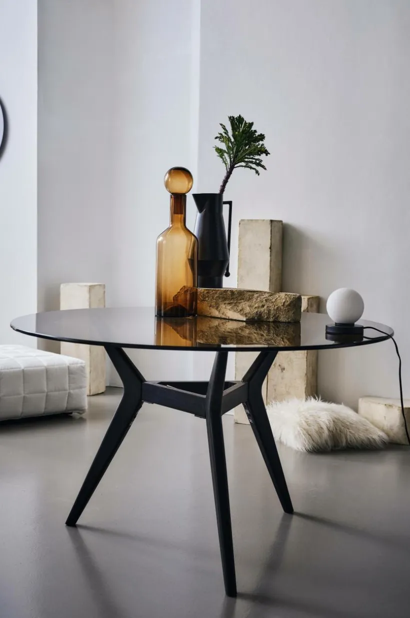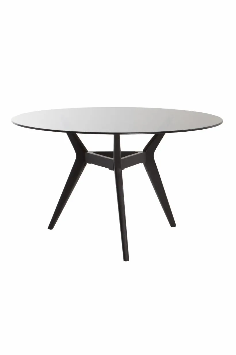Runt, stilrent matbord med ben av acaciaträ som står i kontrast till den rökfärgade bordsskivan av glas. Bordets underrede är en snygg trebent konstruktion som dessutom ger bra utrymme för benen. Runt bordet sitter sex personer bekvämt. Att samlas vid ett runt matbord ger samhörighet och gemenskap.