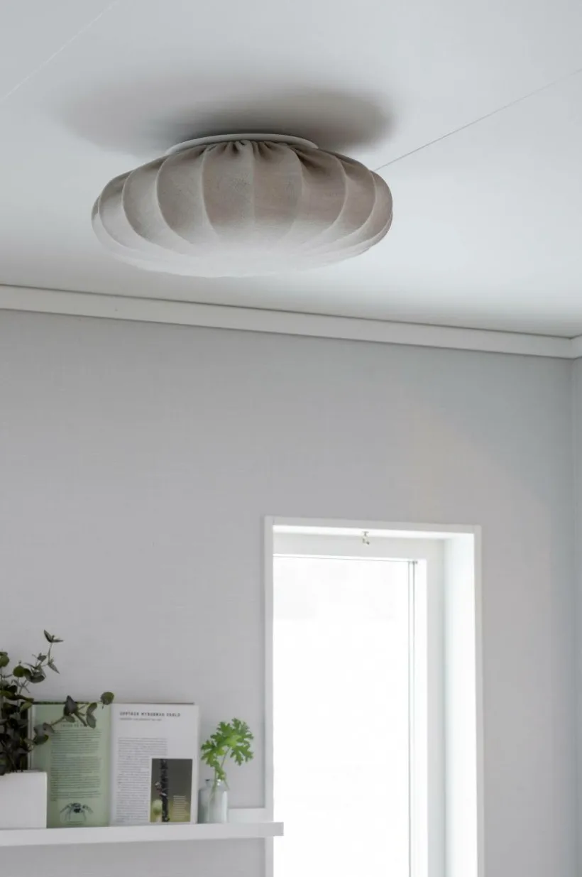 Plafond i linnetyg med vacker struktur. Snygg och stilren plafond som är lika fin tänd som släckt. Plafonden kräver 3 stycken klotlampor med E27 sockel, max 60w. Takkontakt och ljuskälla köpes separat.
