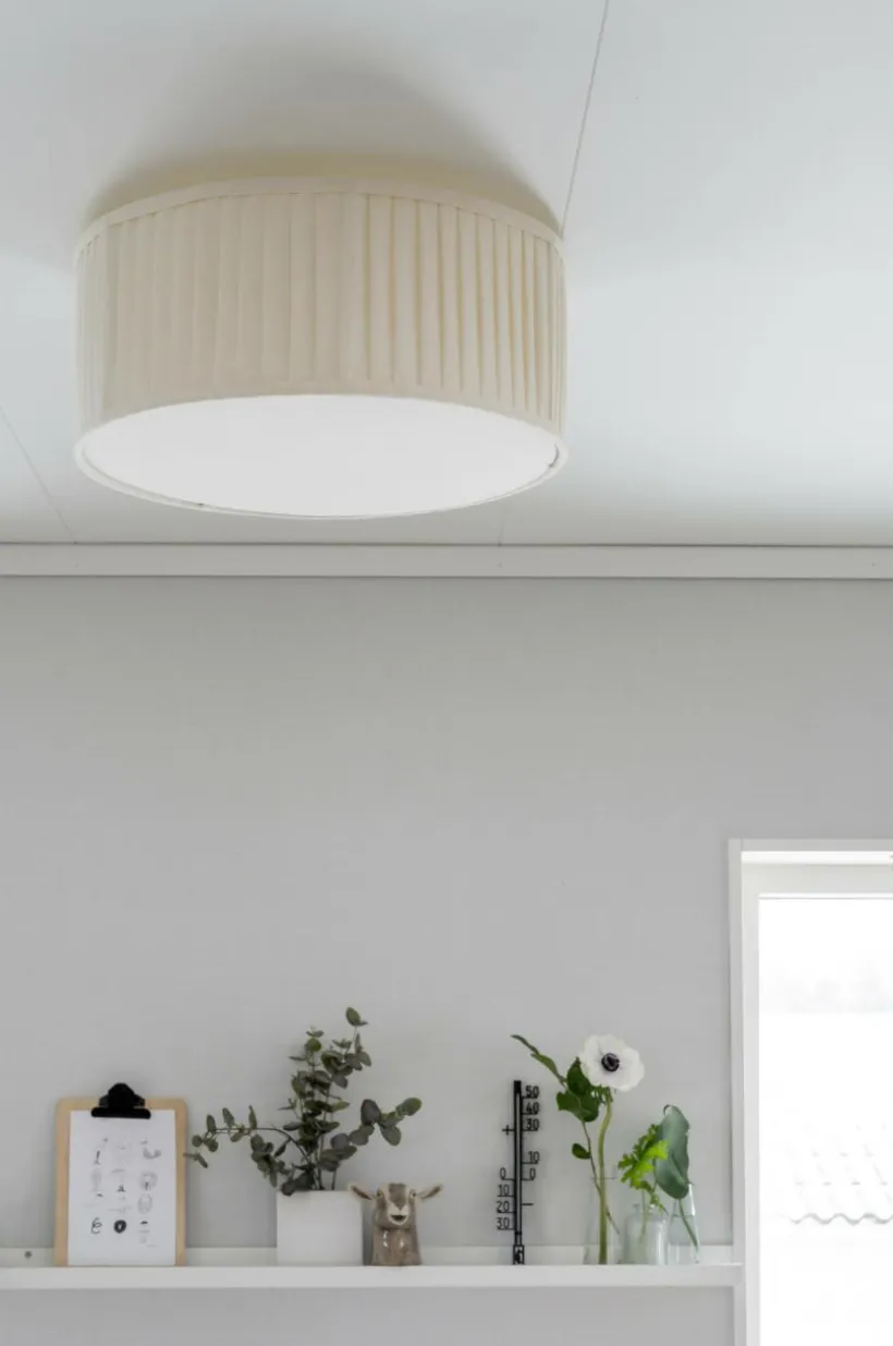 Fin och stilren plafond i ett härligt linnetyg. Taklampan kräver 3 stycken glödlampor med en E27 sockel, max 60 W. Höjd 18 cm, Ø 45 cm.Takkontakt ingår ej på grund av nytt EU direktiv. De finns att beställa separat.