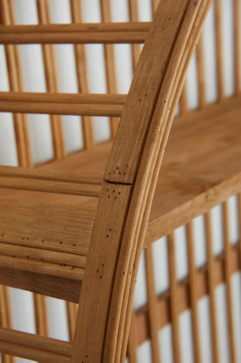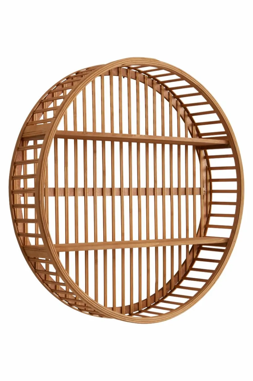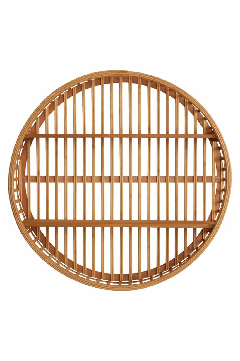 Rund vägghylla av bambu och ädelgran. Hyllplanen är i massivt trä. Den naturliga känslan förstärks av att hela hyllan är obehandlad. Två metallöglor på baksidan för upphängning på väggen.