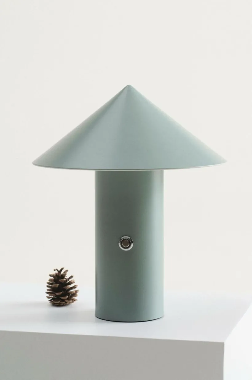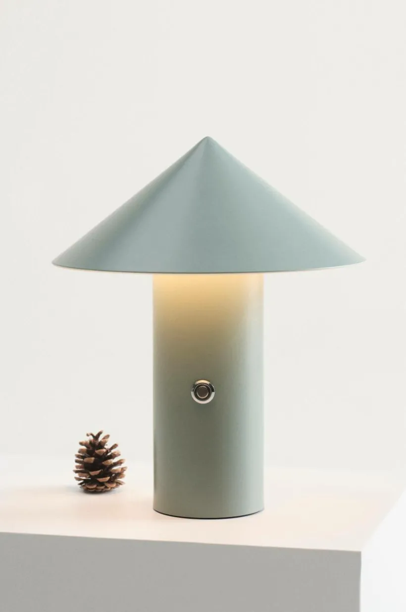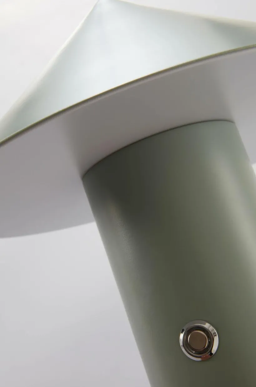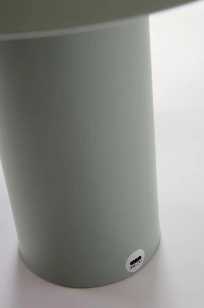 Batteridriven bordslampa med uppladdningsbart batteri och dimmerfunktion. Lampfot och skärm är i metall med lackad yta. Lampan är uppladdningsbar och ansluts med USB-C, laddsladd medföljer. Knappen på lampfoten trycks in för att dimra ljuset. Ljuskällan som är LED är integrerad i lampan.