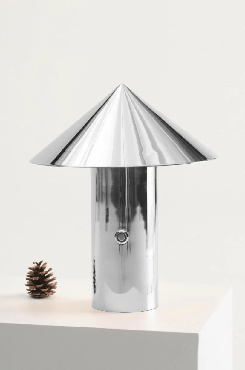 Batteridriven bordslampa med uppladdningsbart batteri och dimmerfunktion. Lampfot och skärm är i metall med lackad yta. Lampan är uppladdningsbar och ansluts med USB-C, laddsladd medföljer. Knappen på lampfoten trycks in för att dimra ljuset. Ljuskällan som är LED är integrerad i lampan.