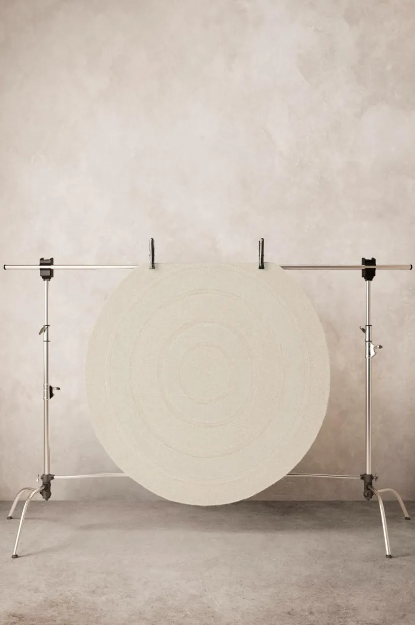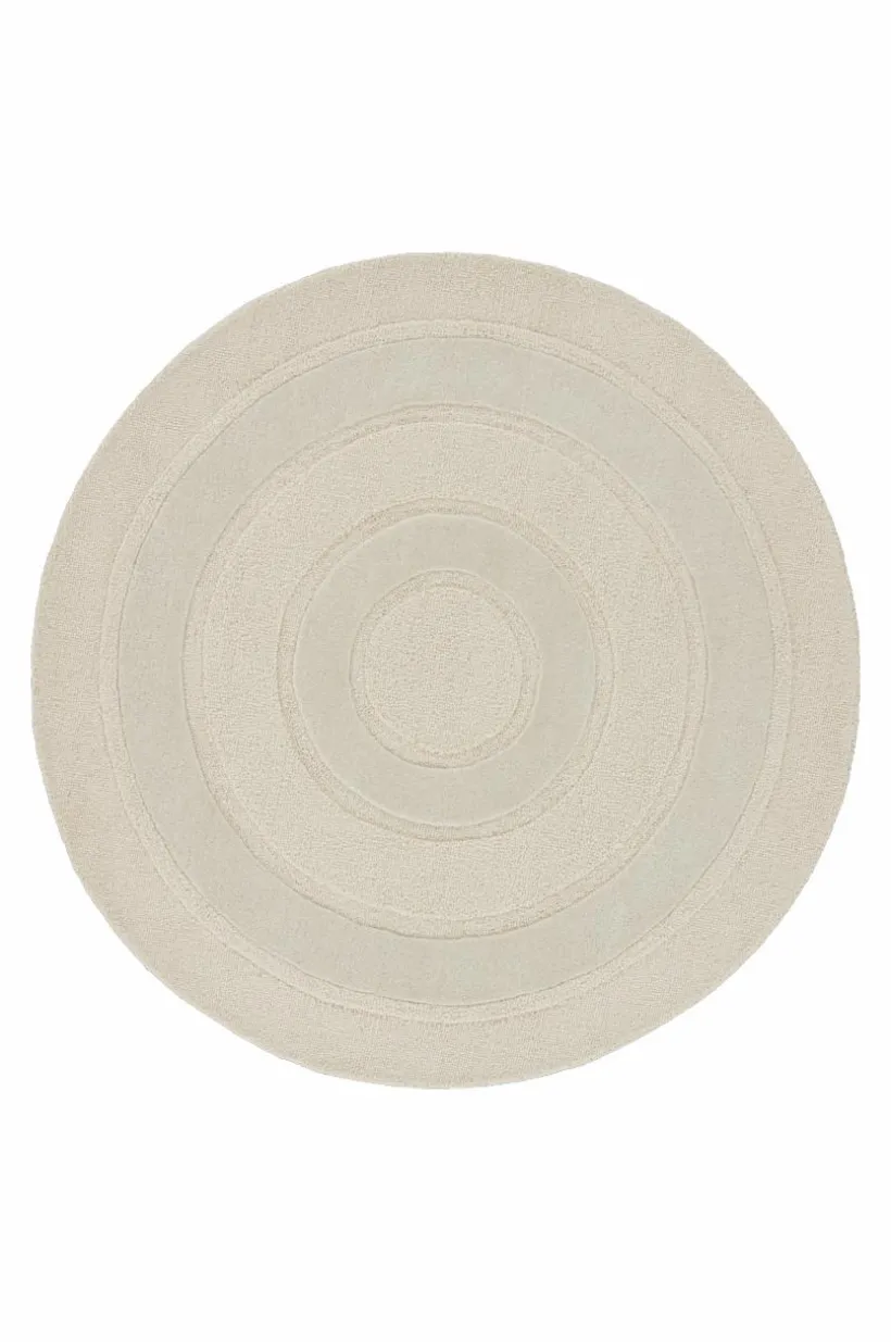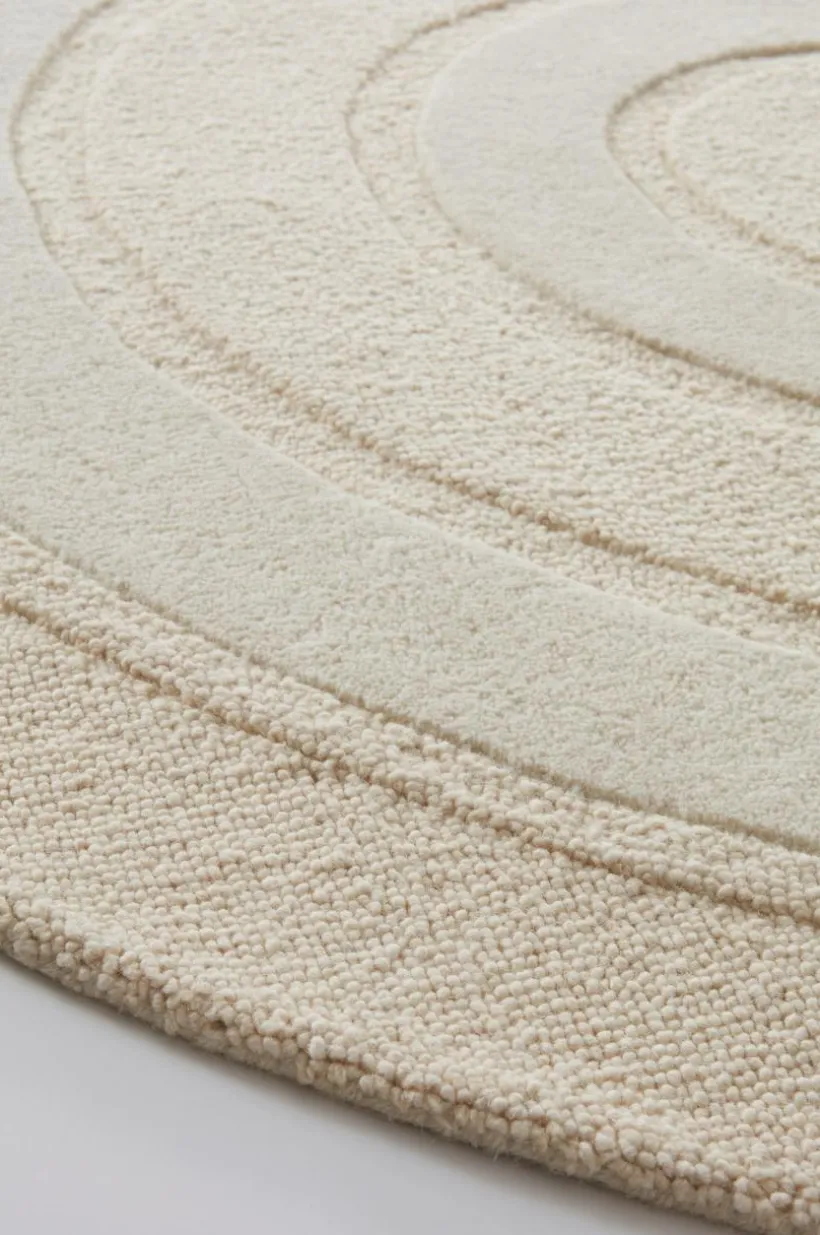 Rund, handtuftad ullmatta med cirkelmönster som skapats av olika höjd på luggen och olika vävteknik. Den tätvävda mattan har klippt lugg kombinerat med vävda öglor. En handgjord matta är ett fint hantverk och varje matta är unik. Lugghöjd öglor 0,5-0,6 cm, klippt lugg 1-1,2 cm. Tjocklek 1,8-2 cm.3000-3200 g/m².